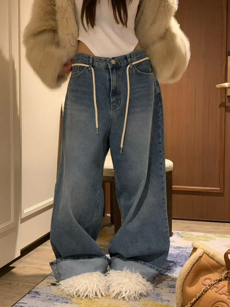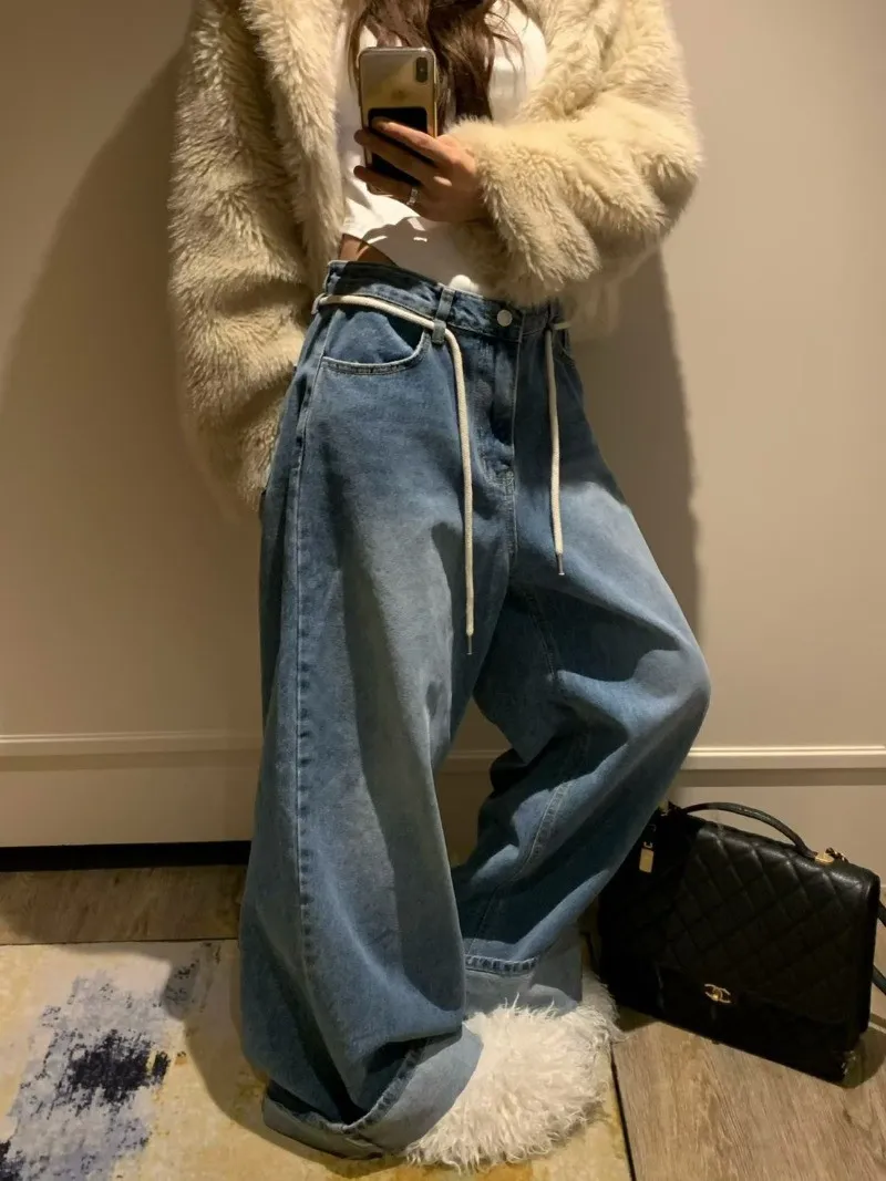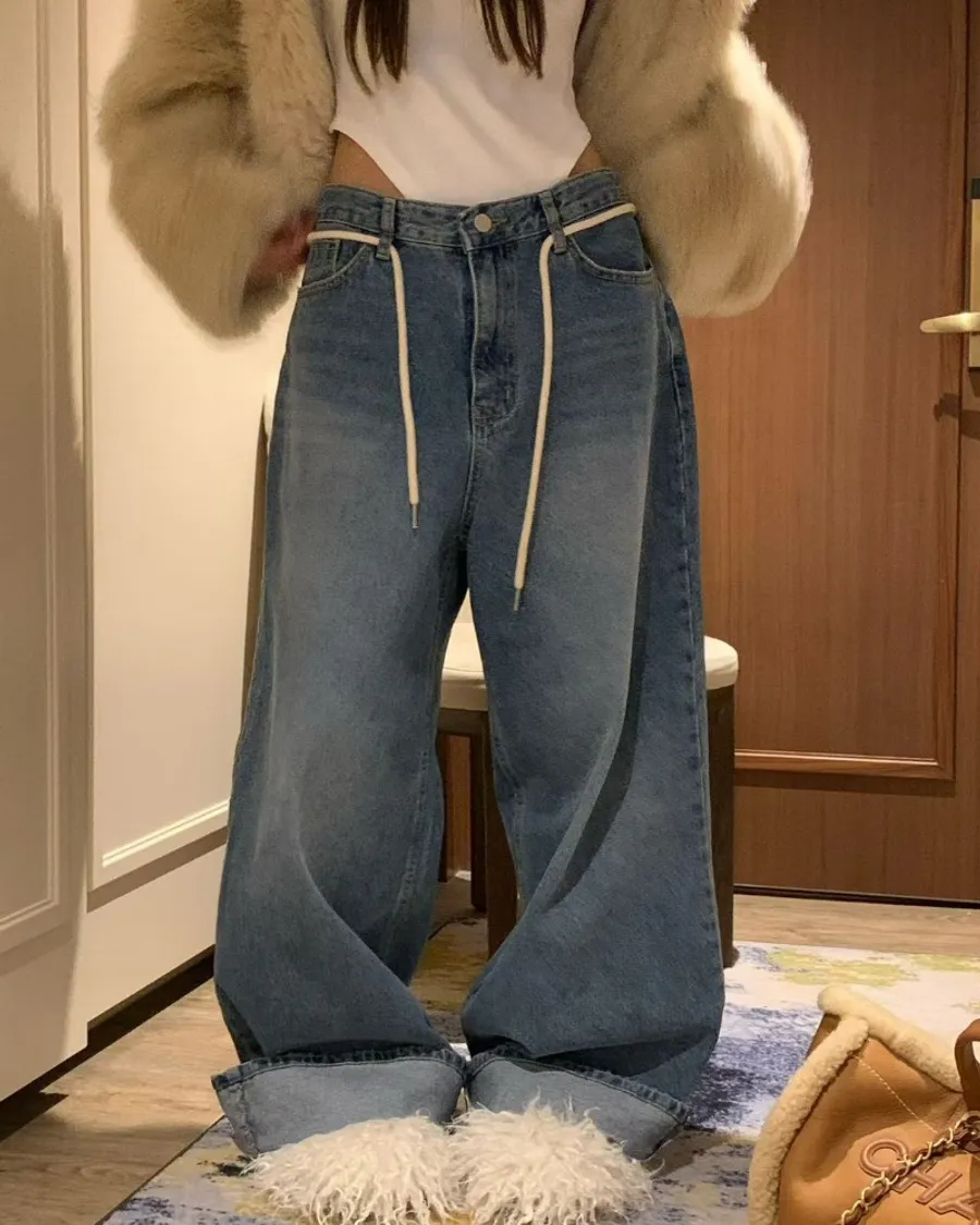 秋冬美式復古直筒顯瘦抽繩寬鬆牛仔褲