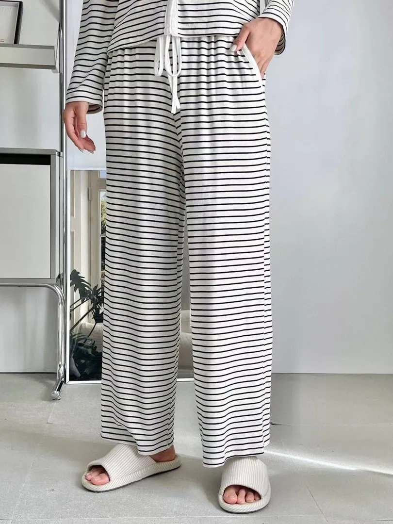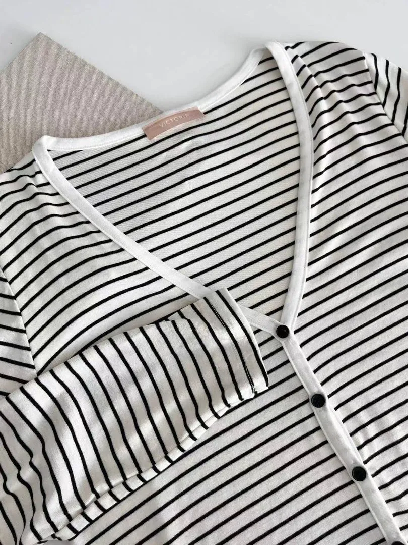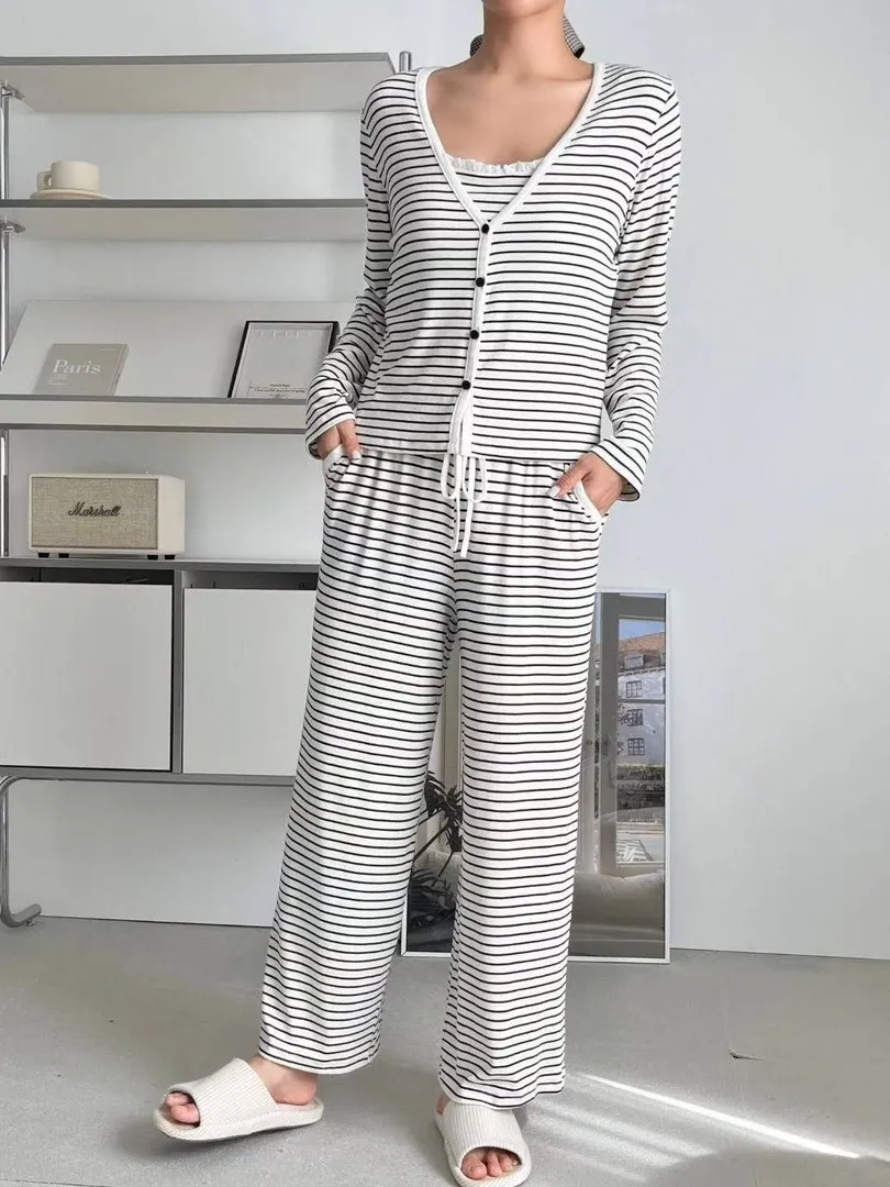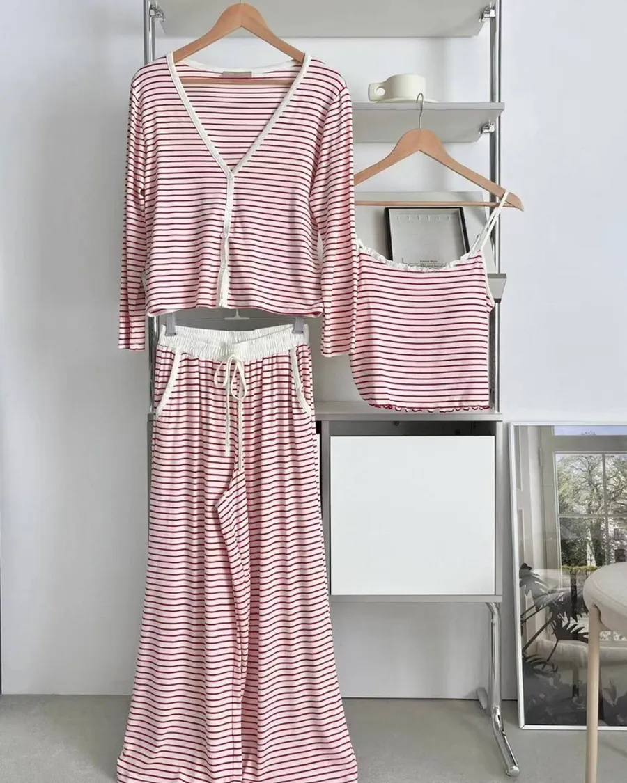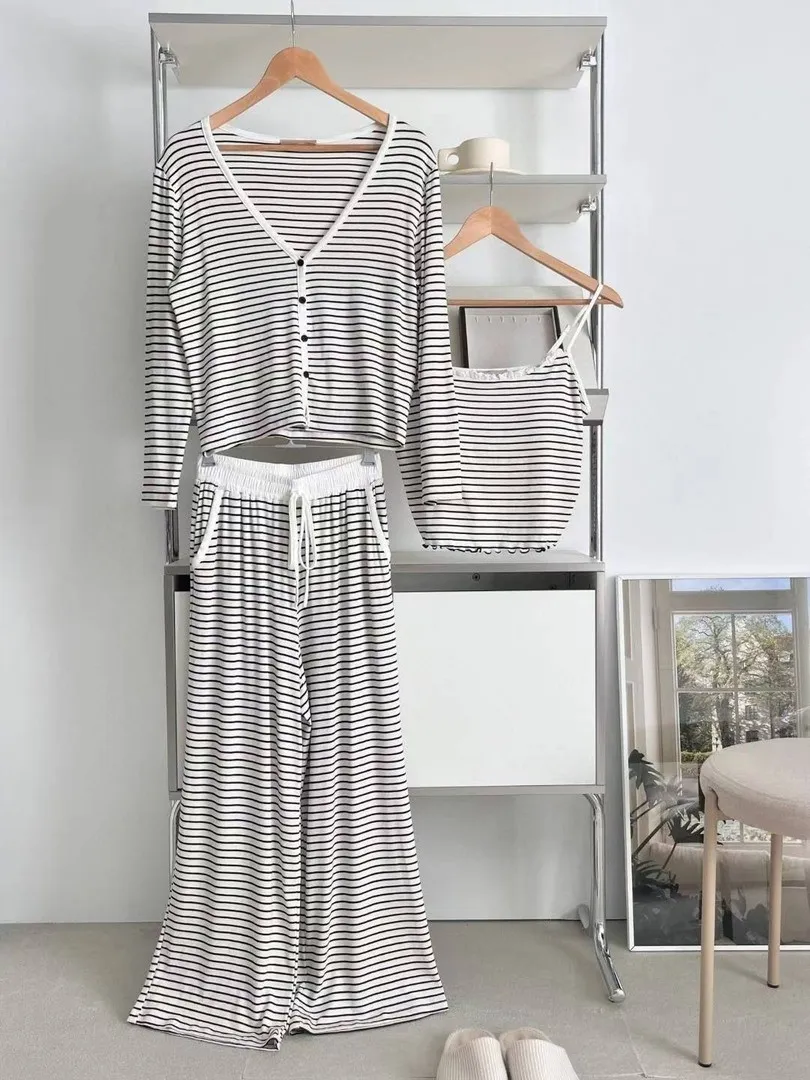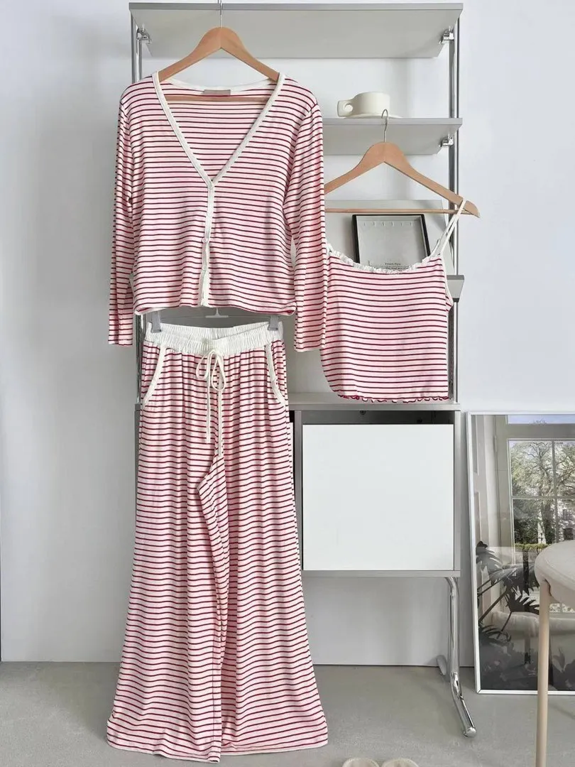秋冬莫代爾棉質條紋吊帶三件式長袖睡衣