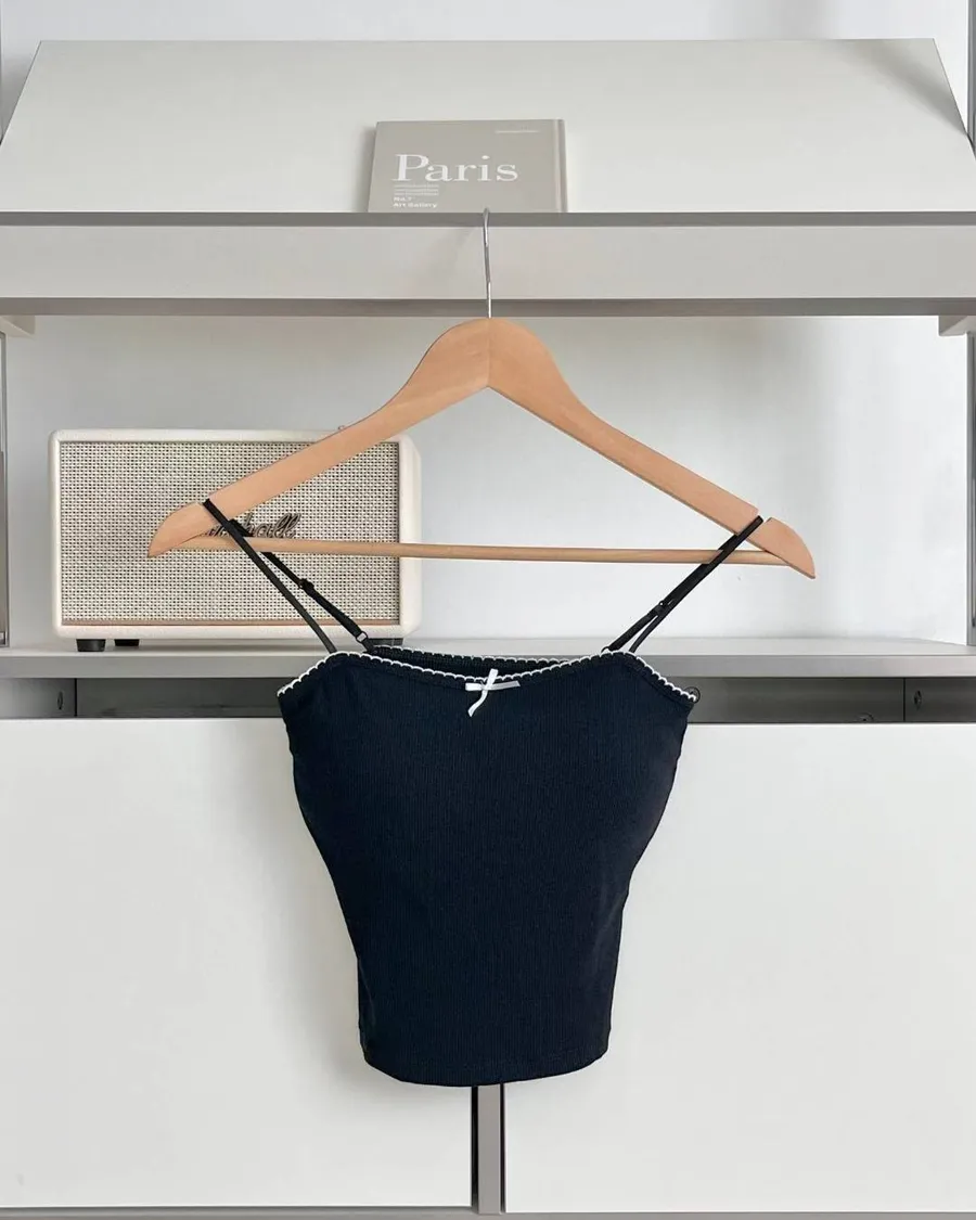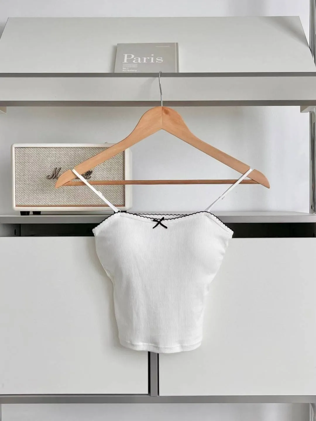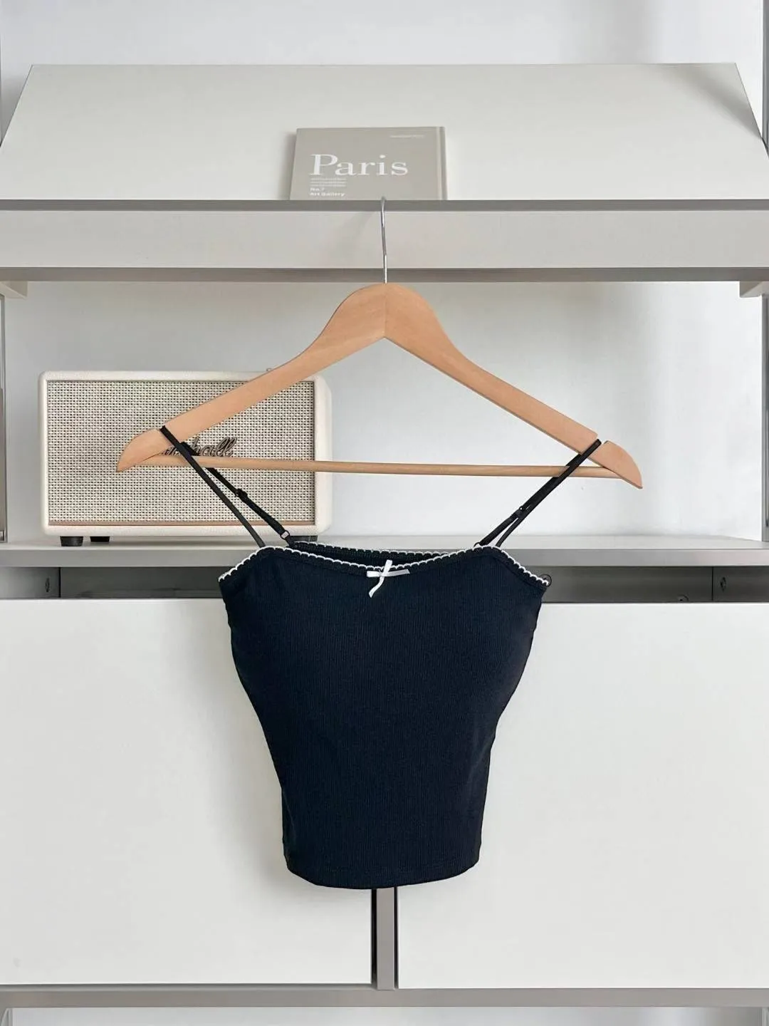 純棉撞色波紋小蝴蝶結拼接細肩帶可外穿短款小背心