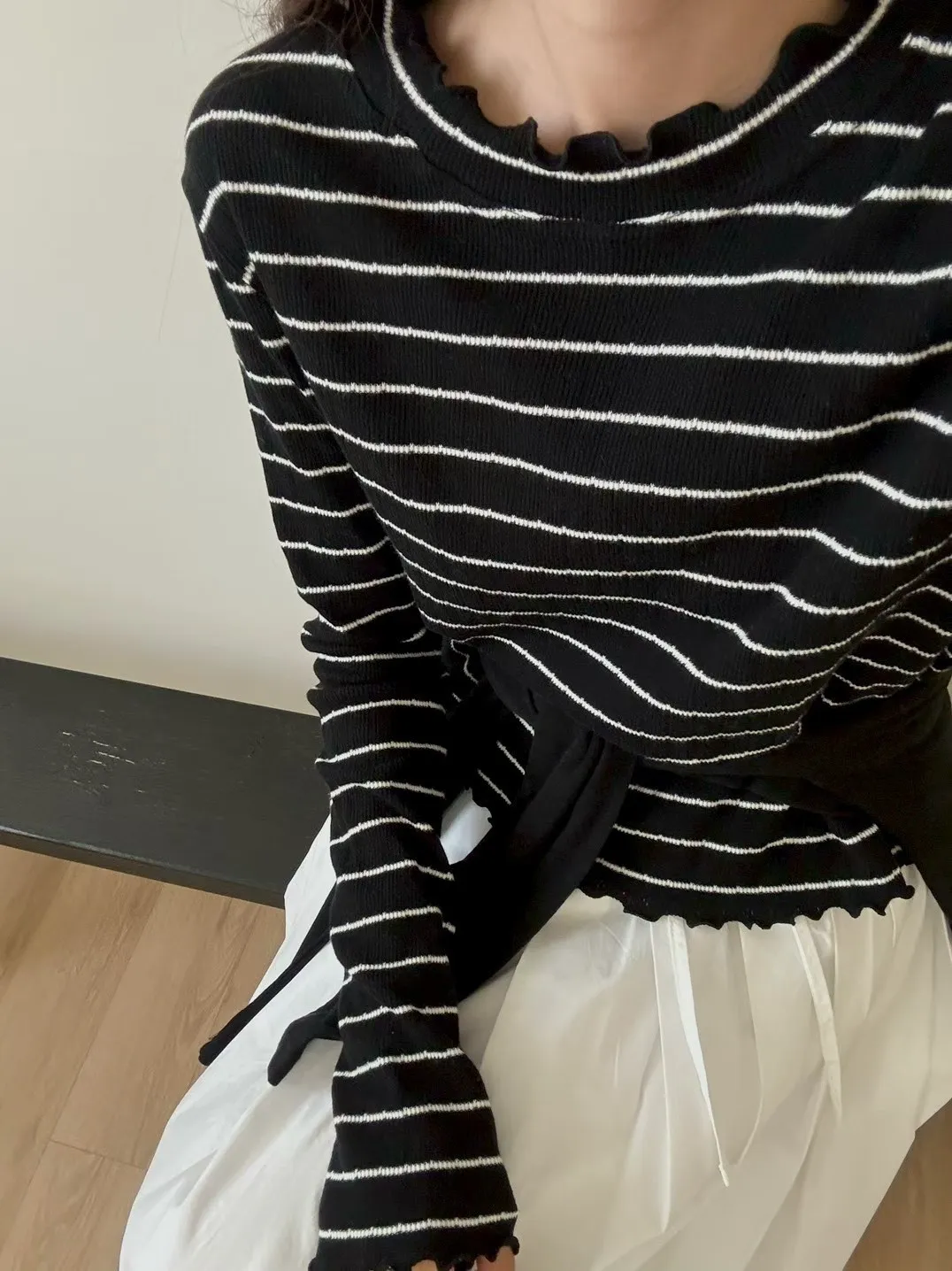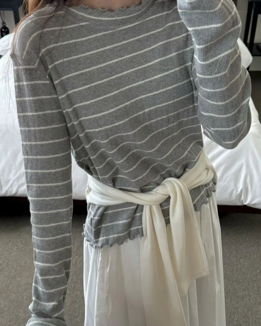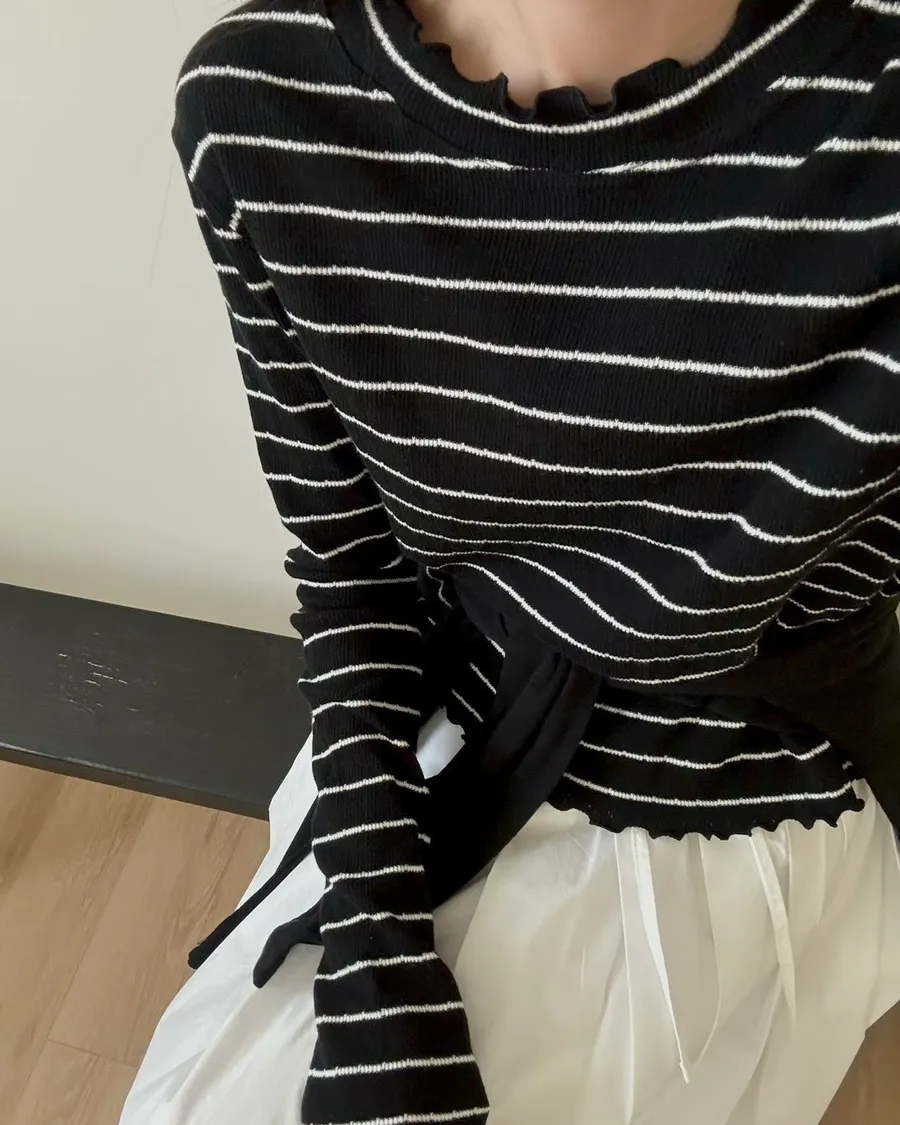 春季小卷邊條紋修身百搭長袖T恤