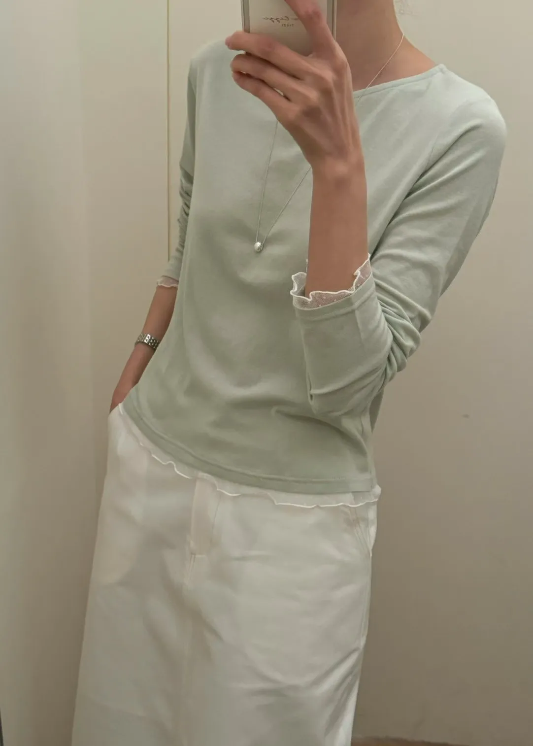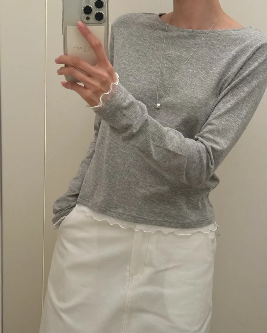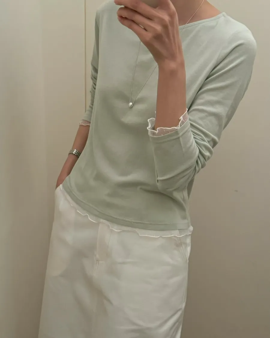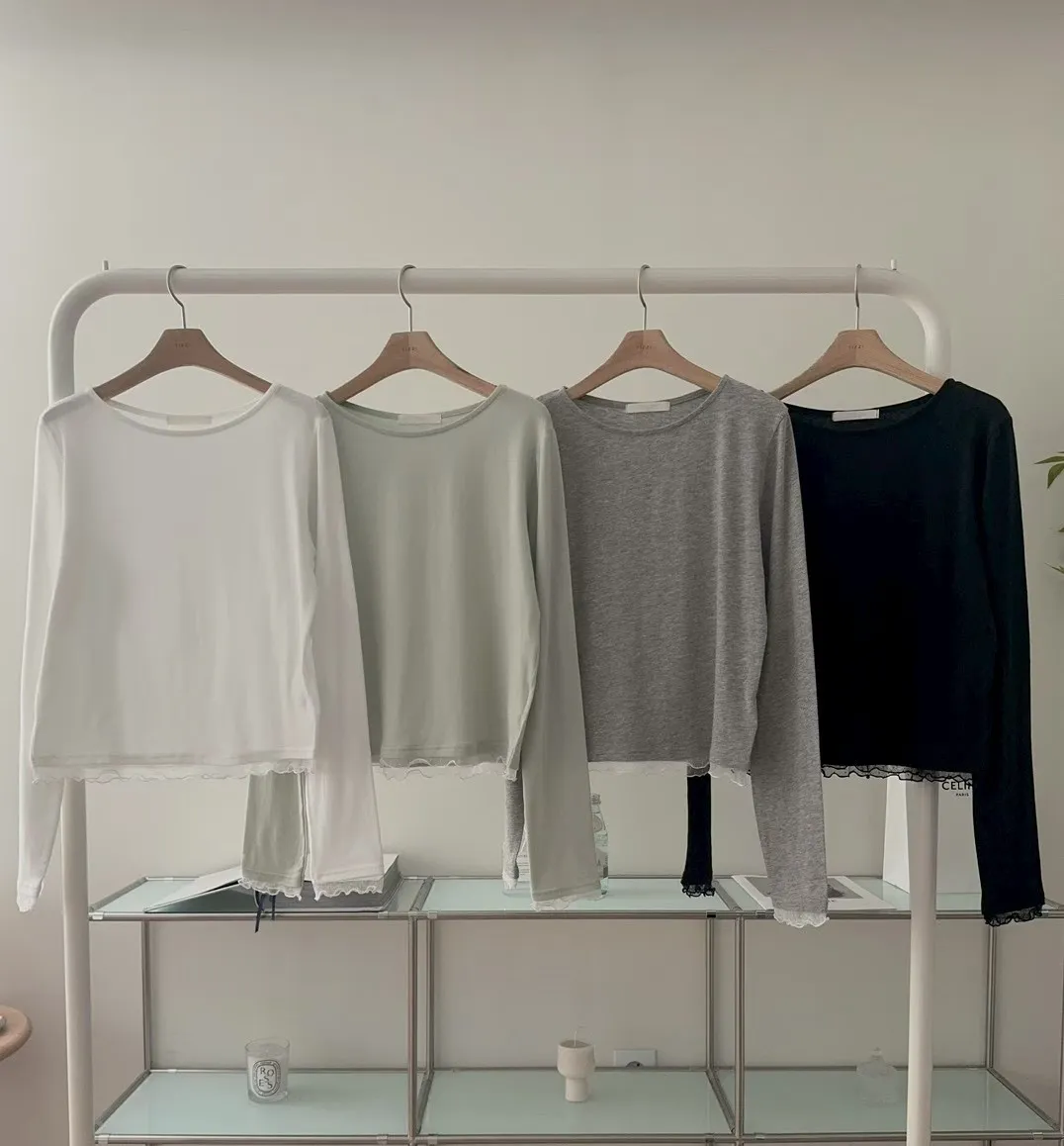 春季純色蕾絲邊裝飾舒適打底T恤