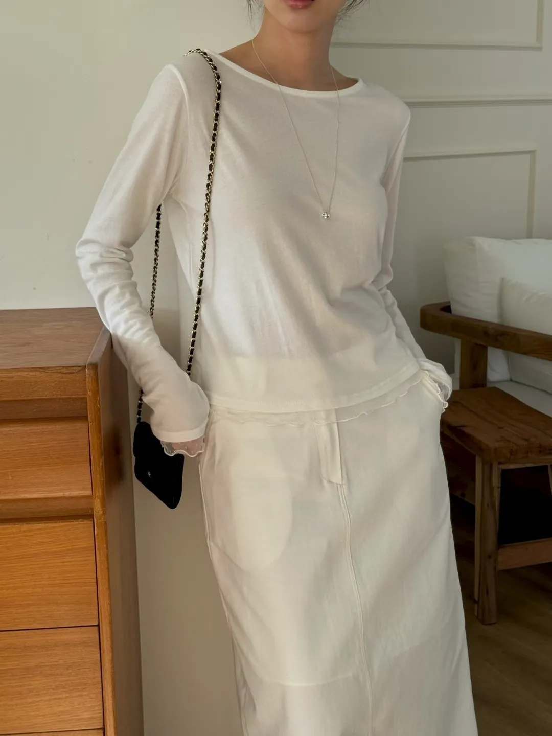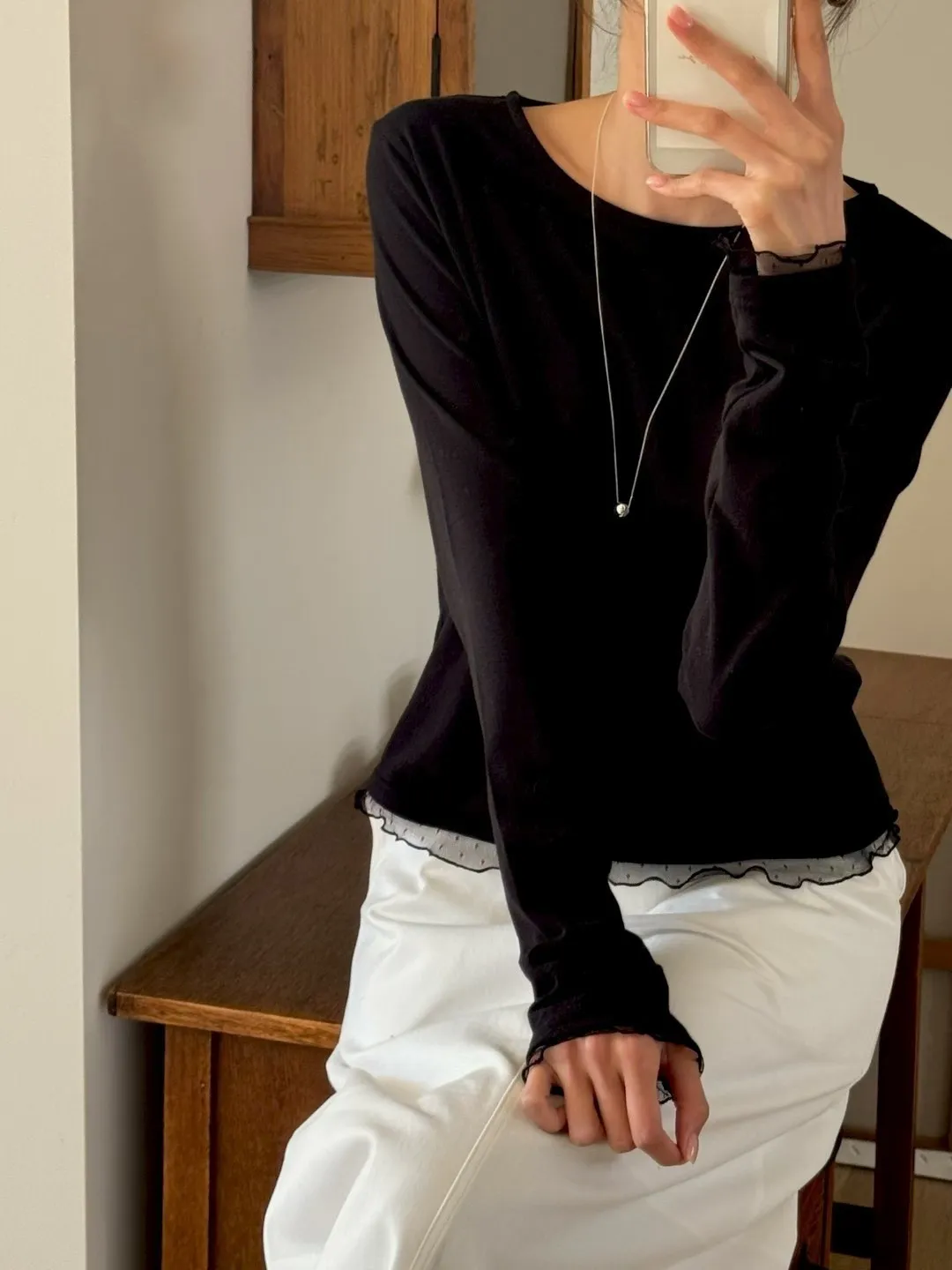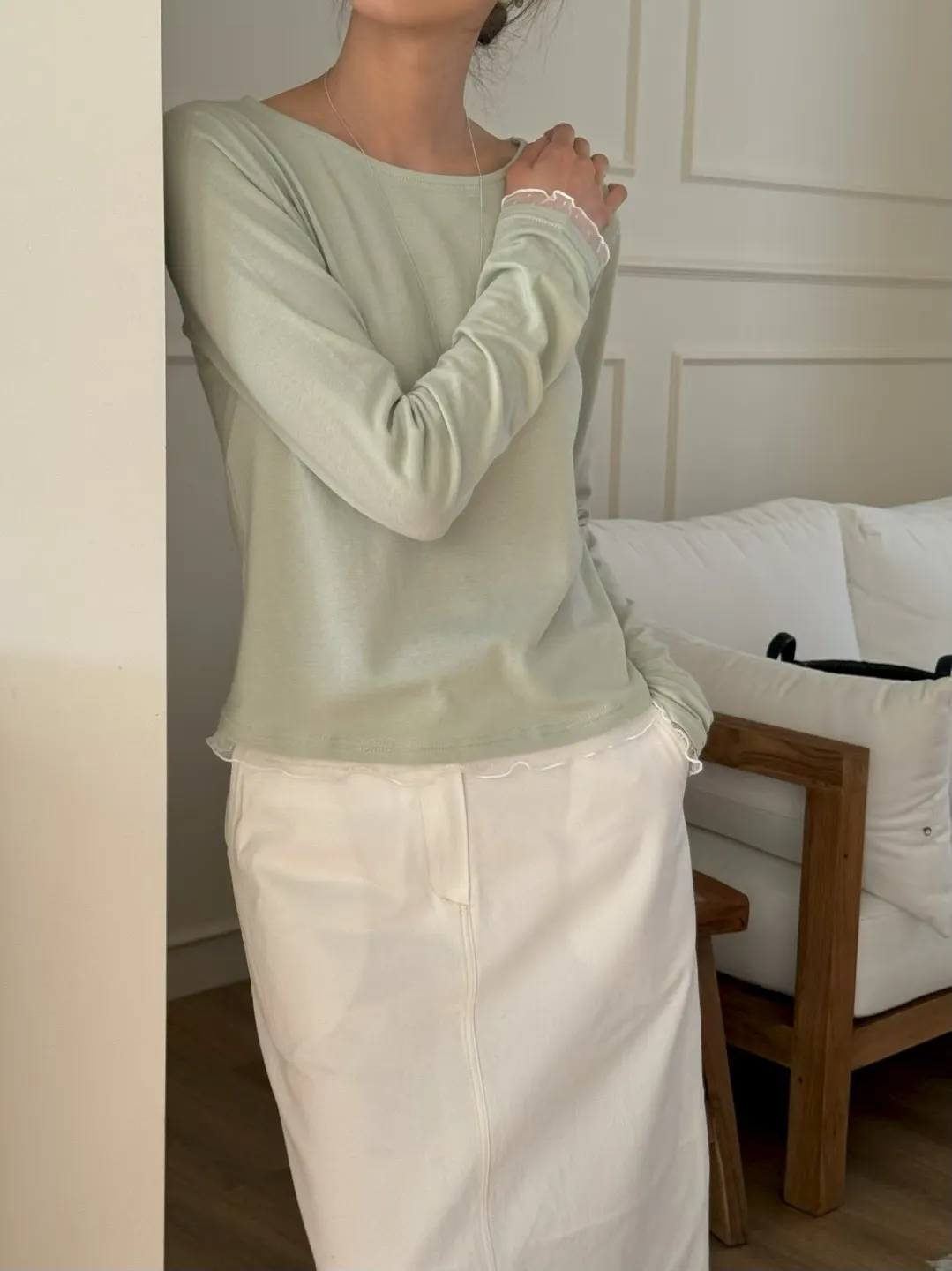 春季純色蕾絲邊裝飾舒適打底T恤