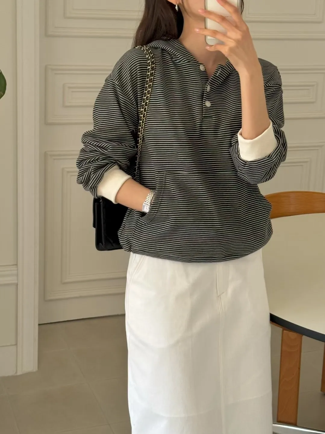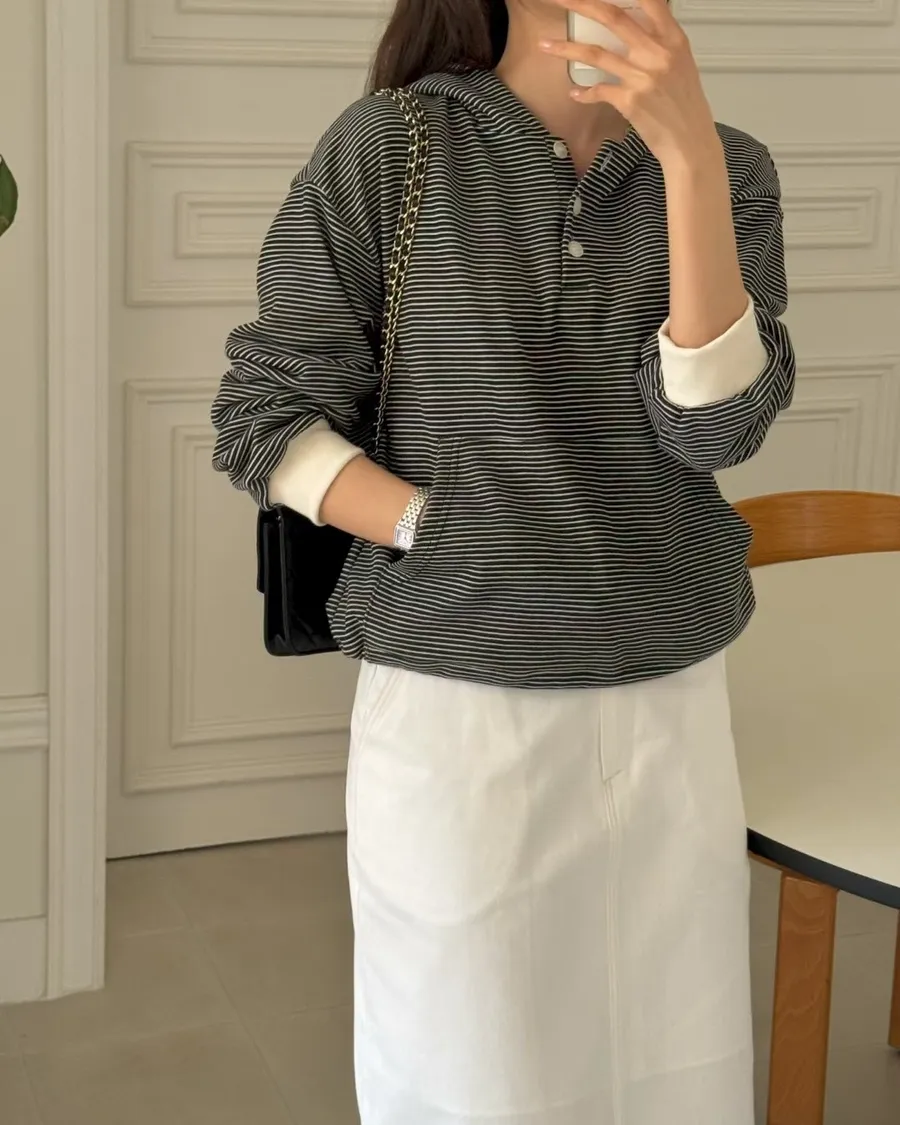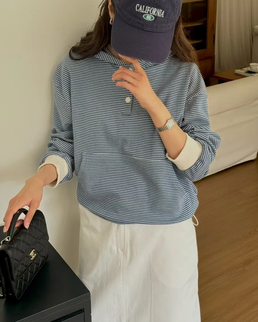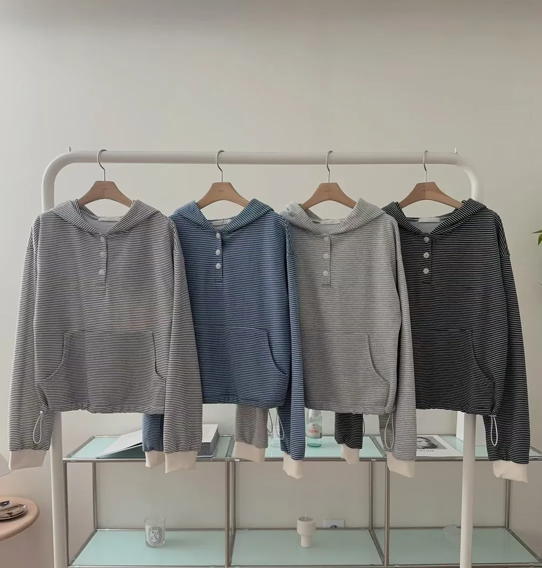 春季休閒抽繩連帽條紋半系扣上衣