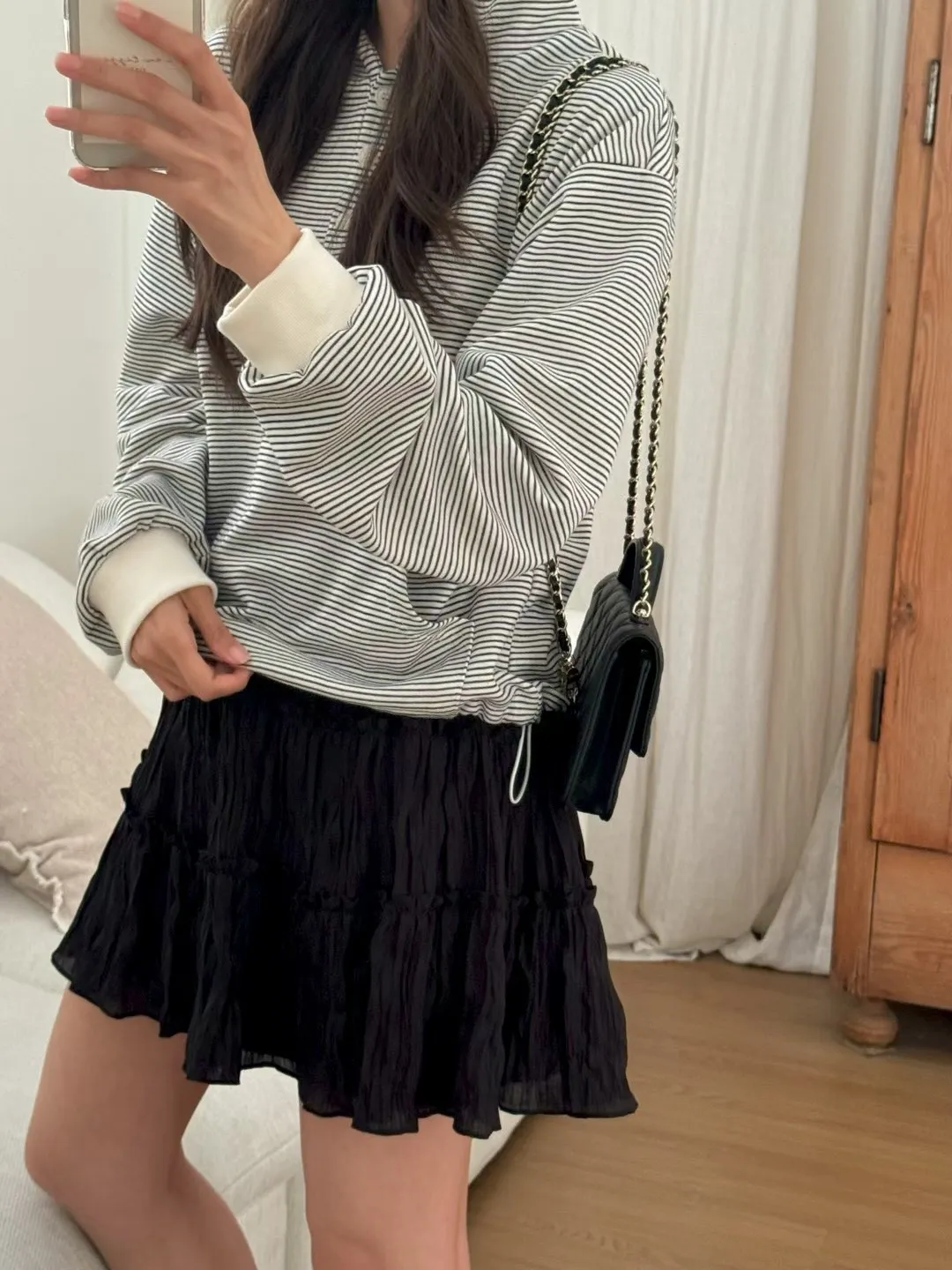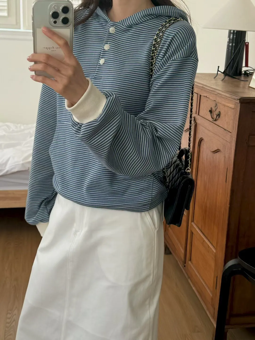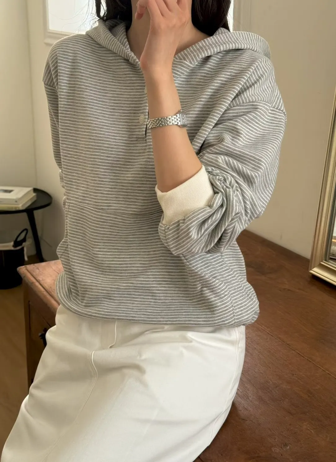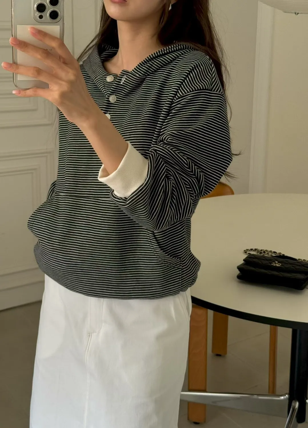 春季休閒抽繩連帽條紋半系扣上衣