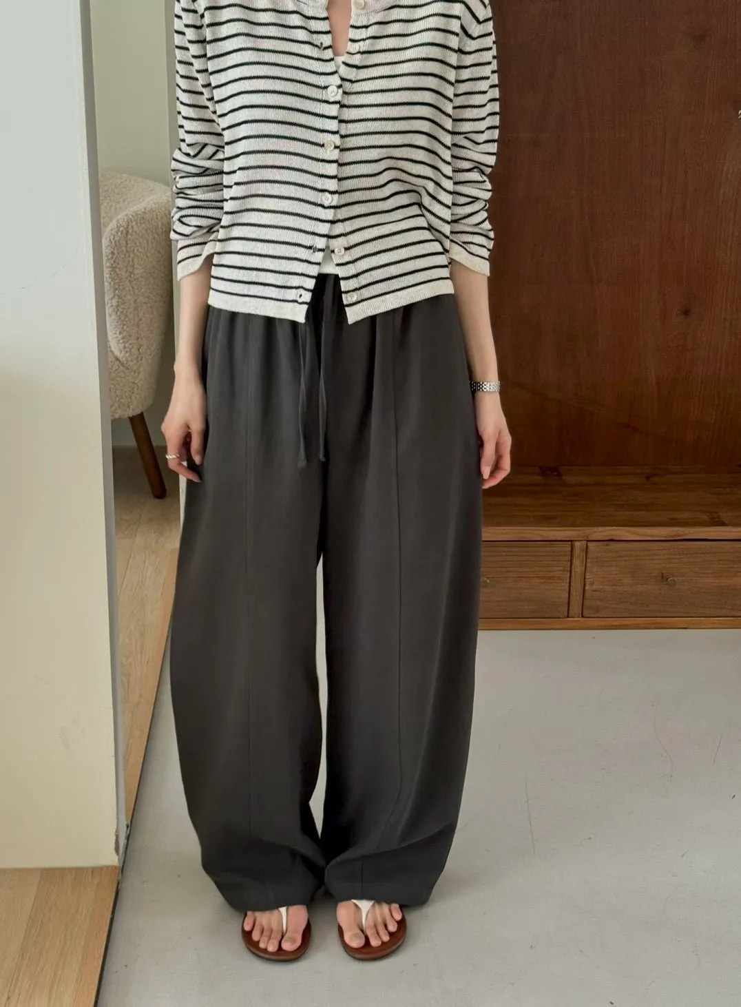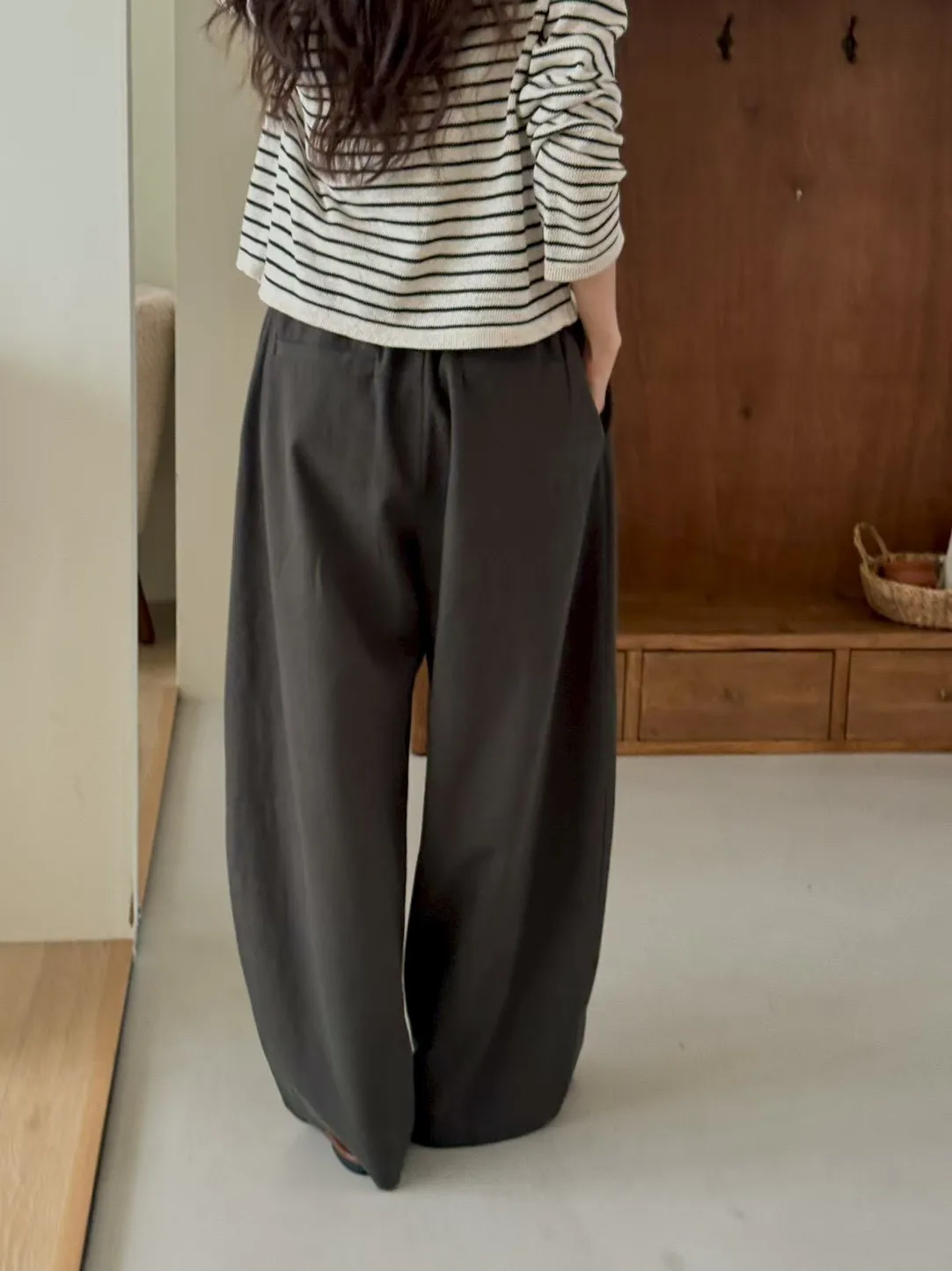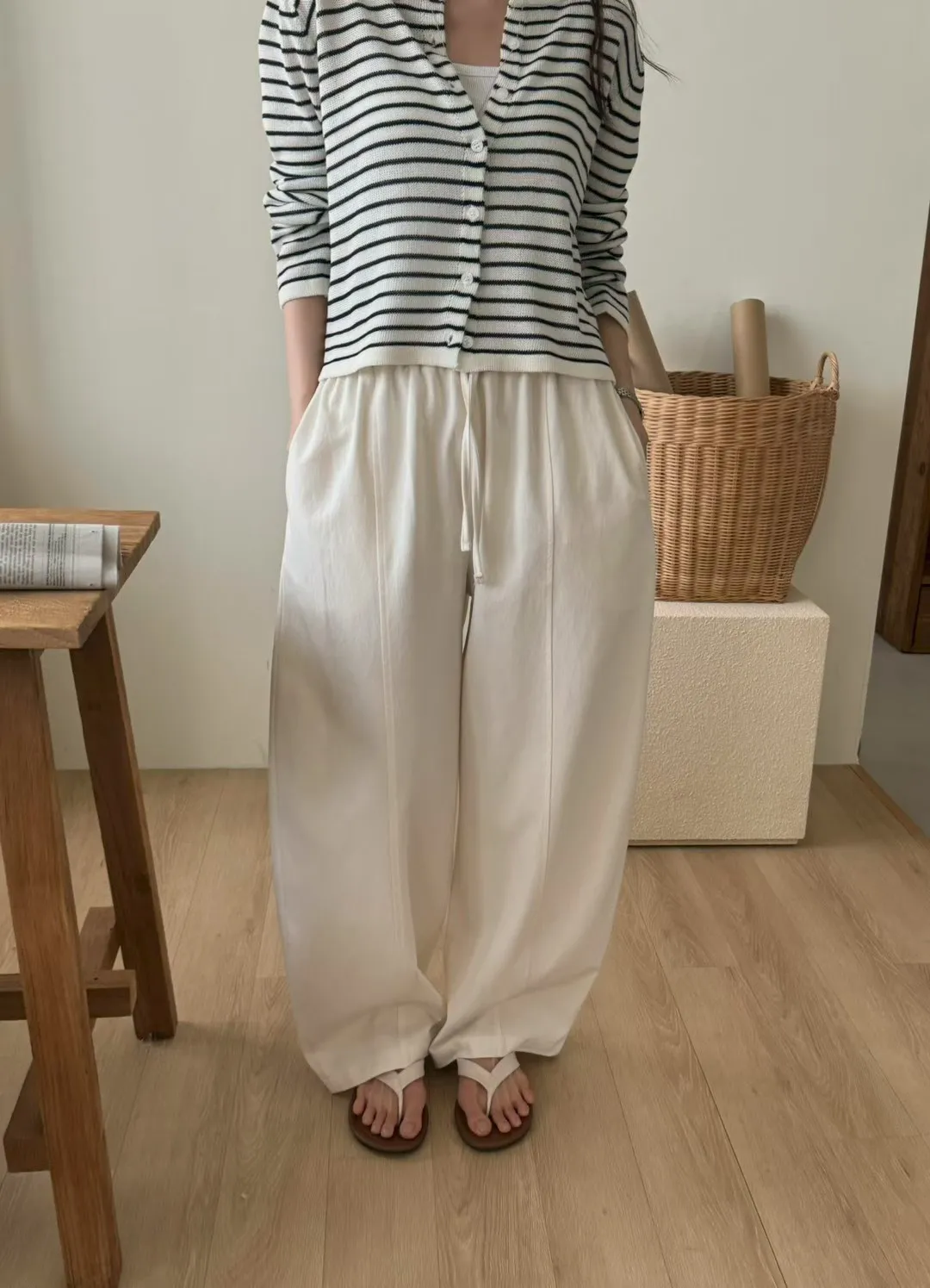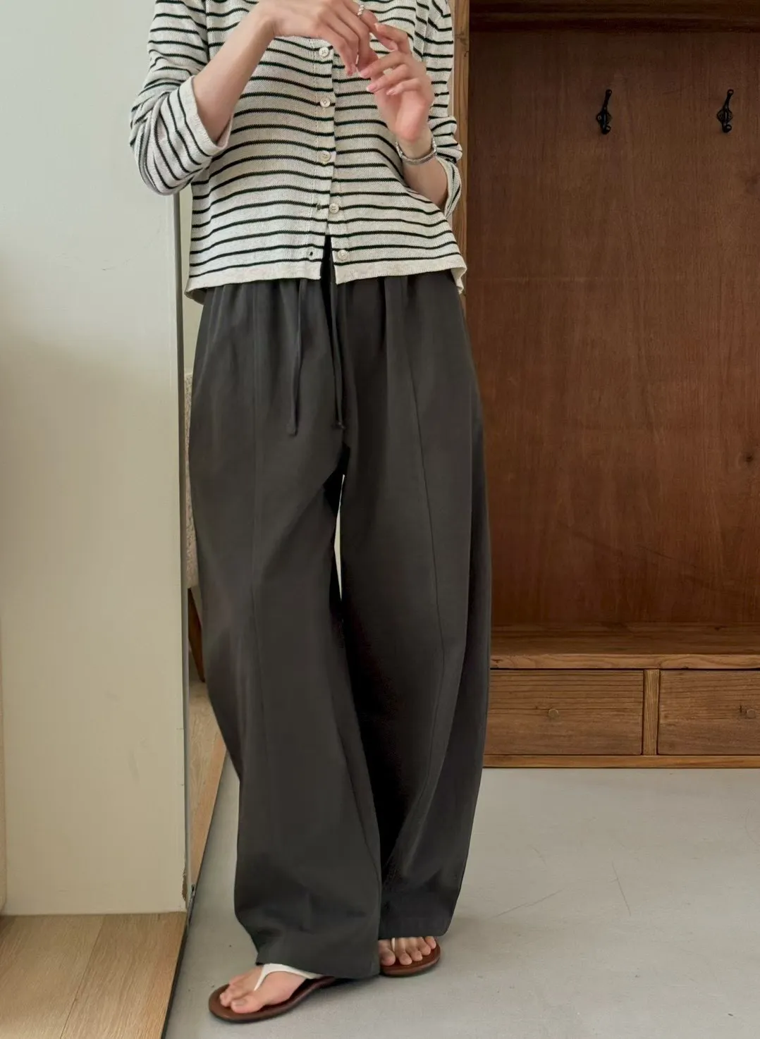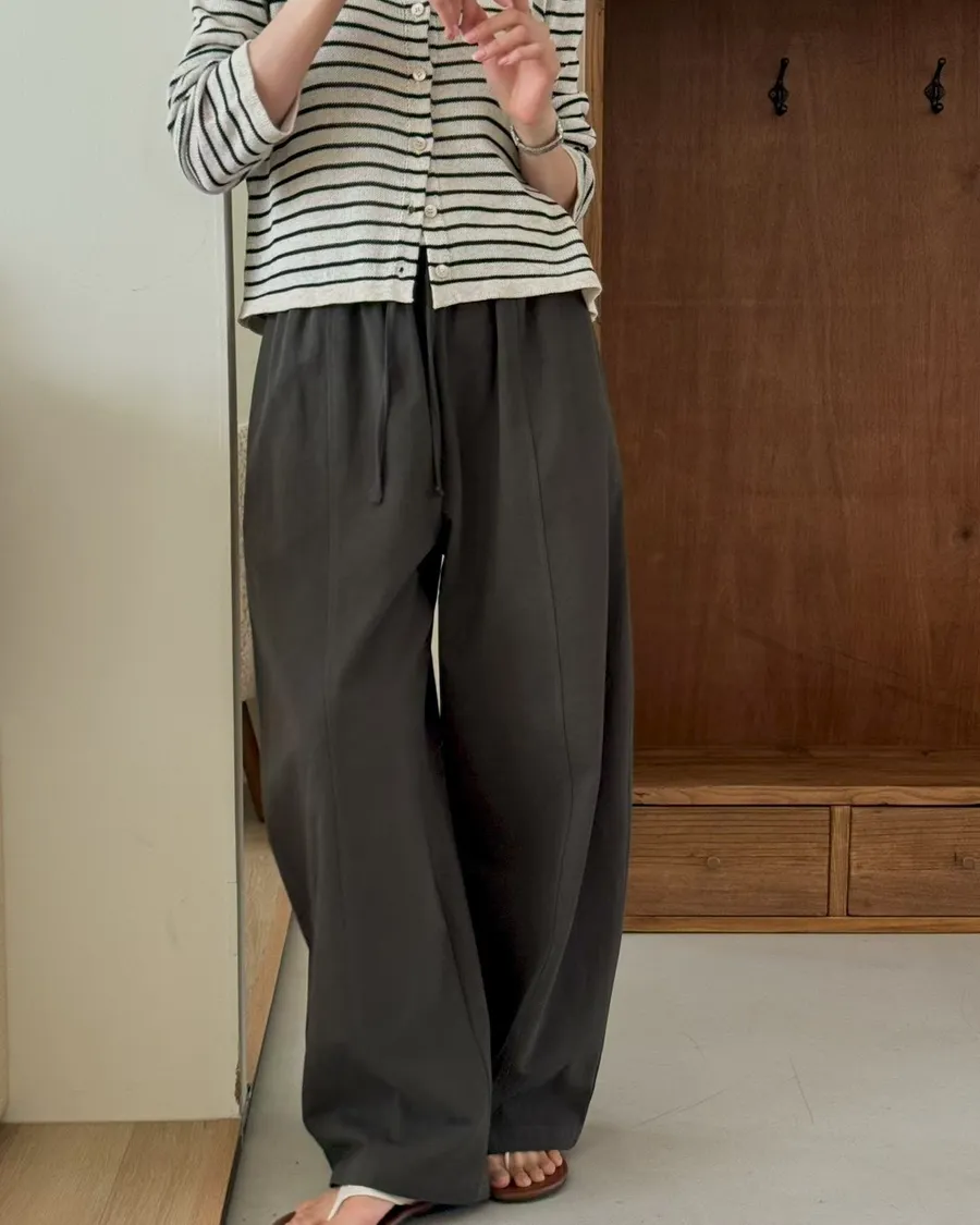 純色抽繩收腰寬鬆休閒褲