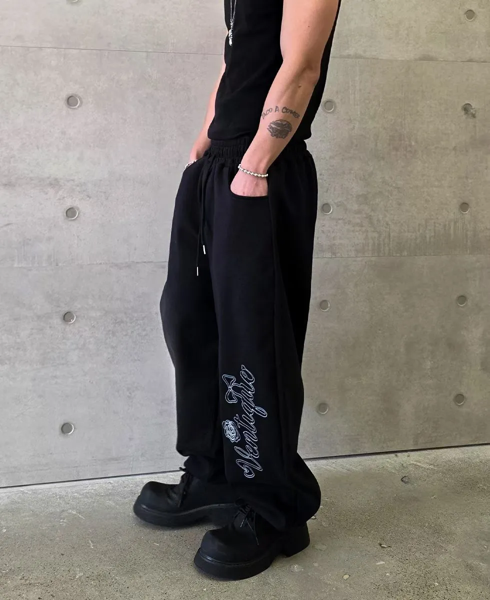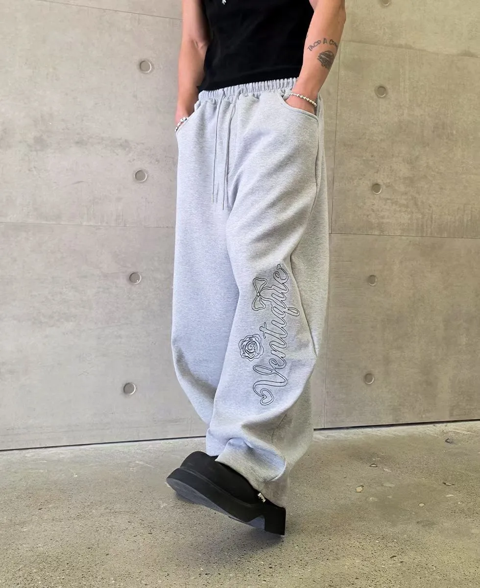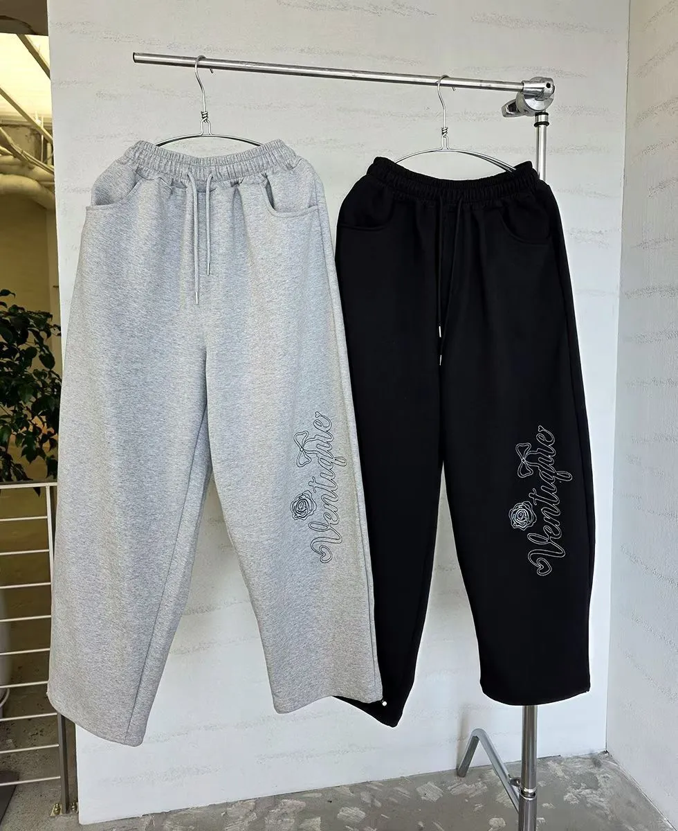 韓版玫瑰蝴蝶刺繡寬鬆舒適曲線鬆緊腰束腳休閒褲