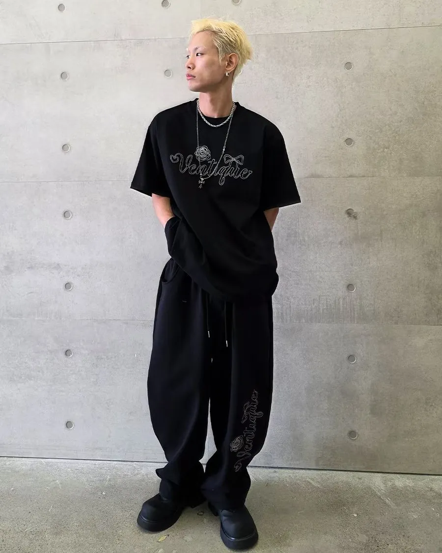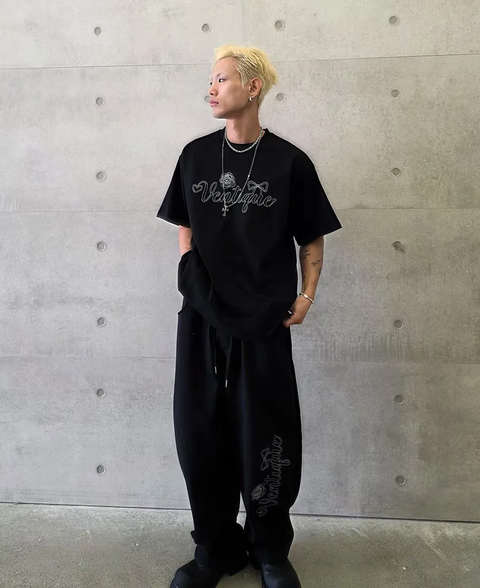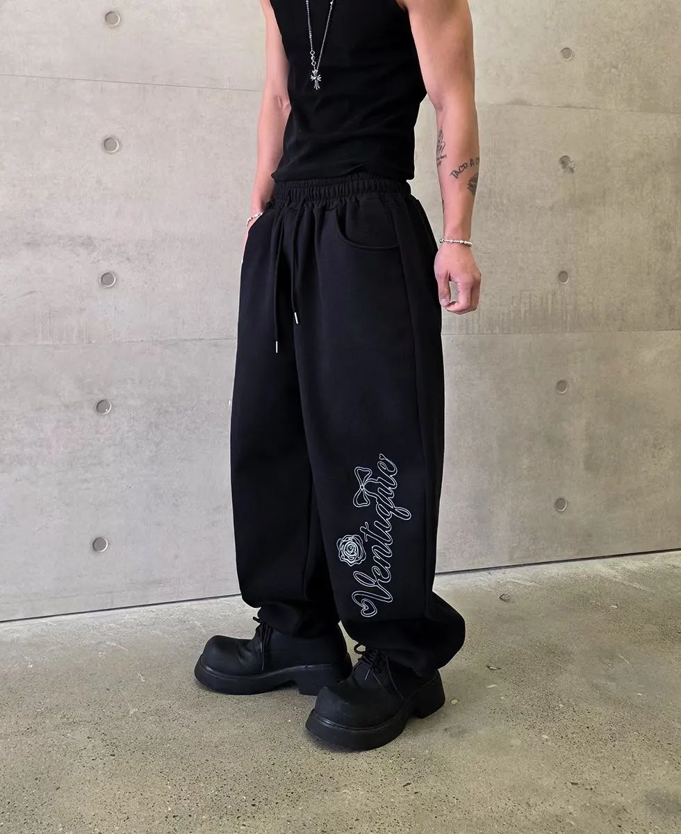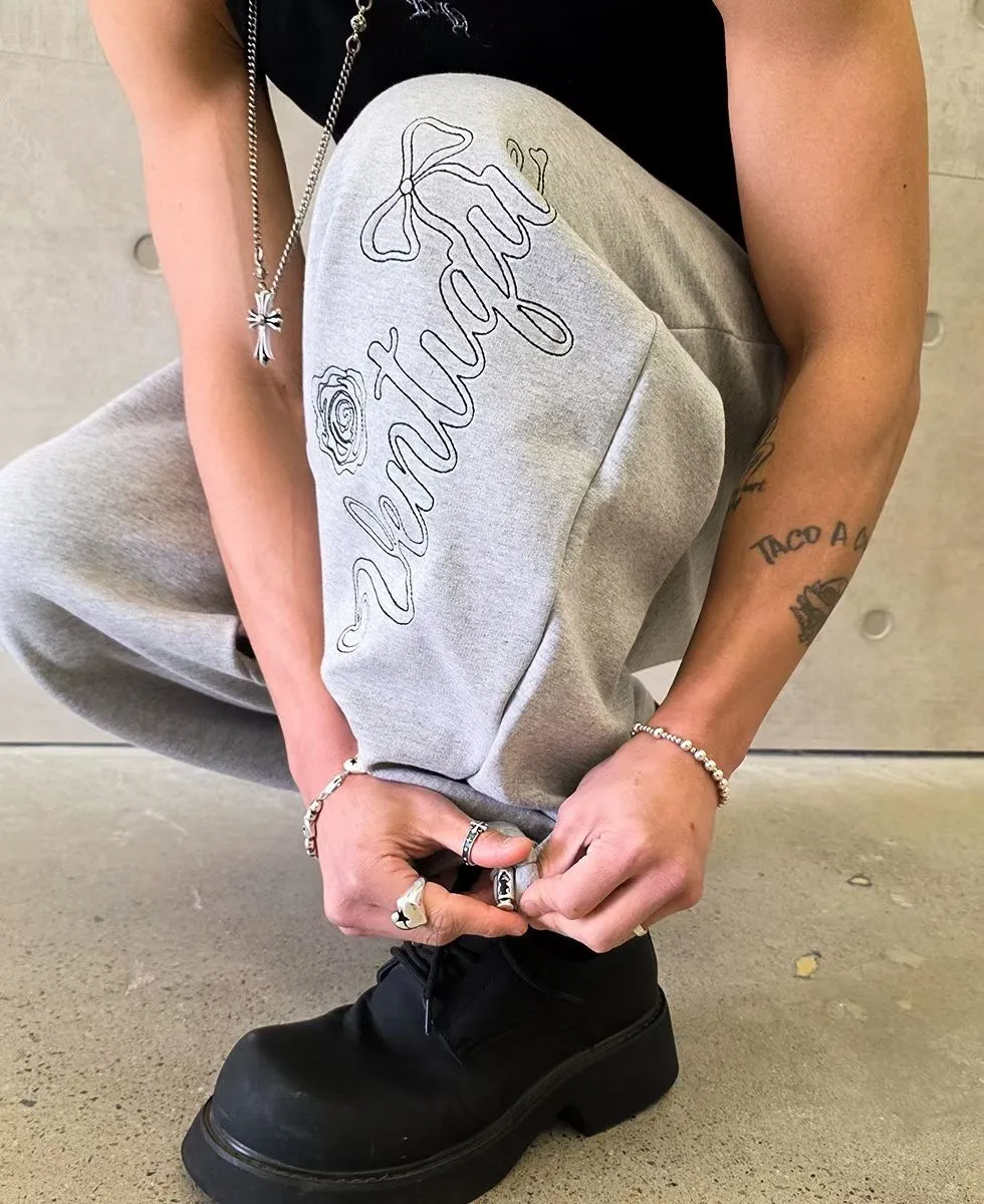 韓版玫瑰蝴蝶刺繡寬鬆舒適曲線鬆緊腰束腳休閒褲