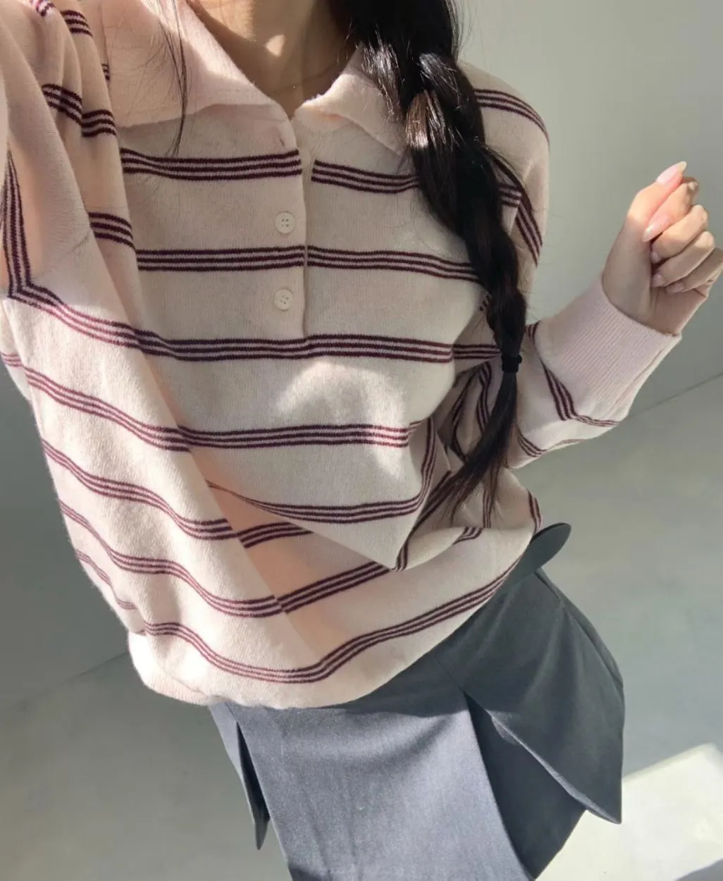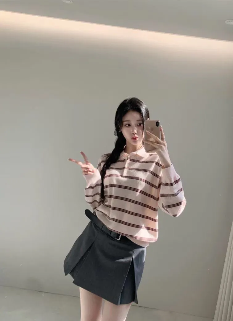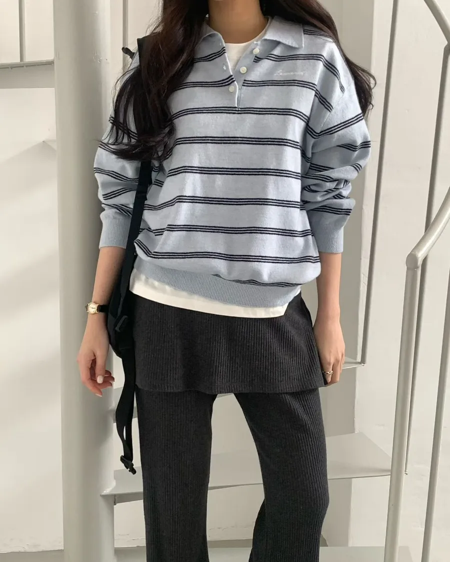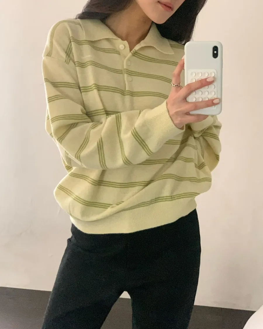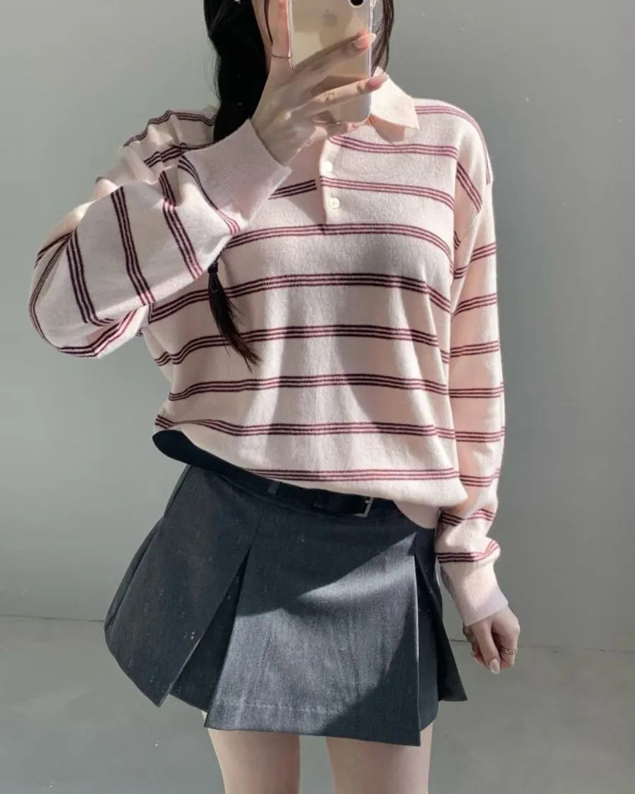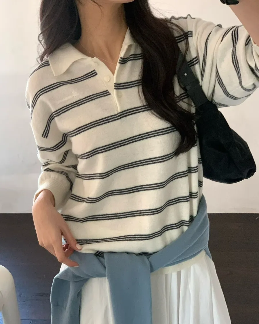 2026春季百搭翻領半系扣條紋針織衫
