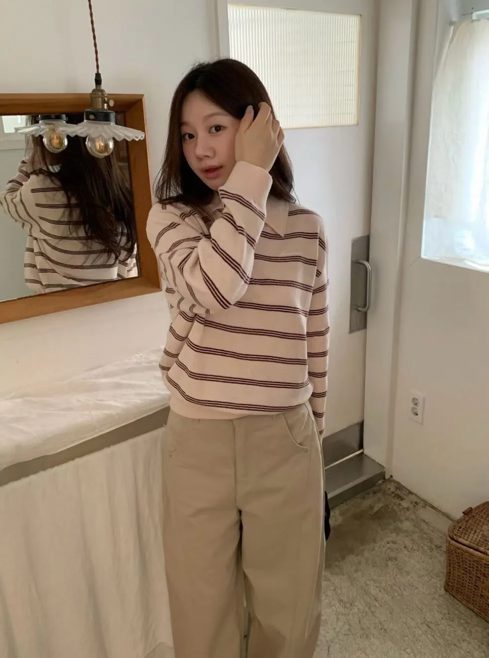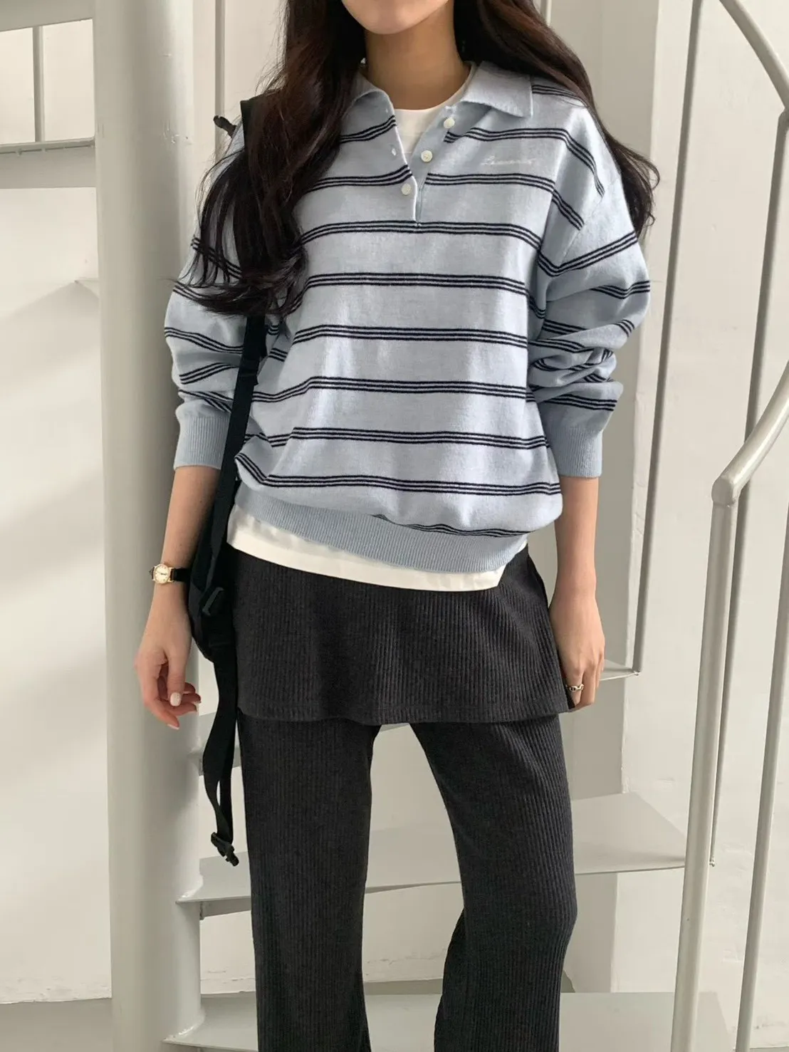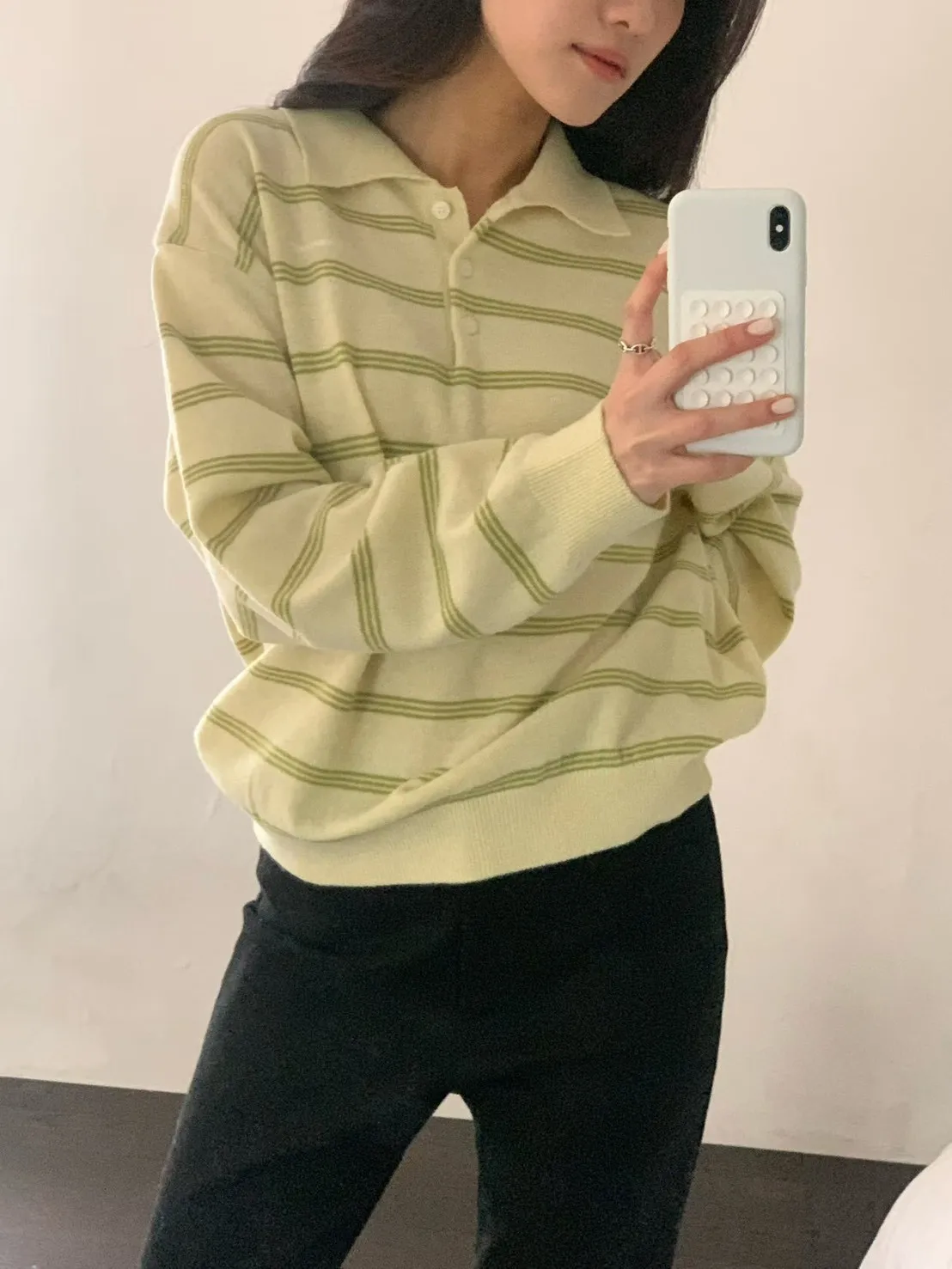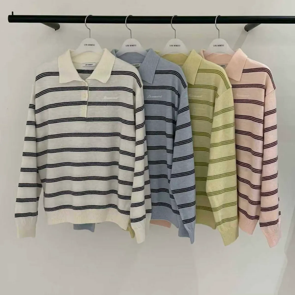 2026春季百搭翻領半系扣條紋針織衫