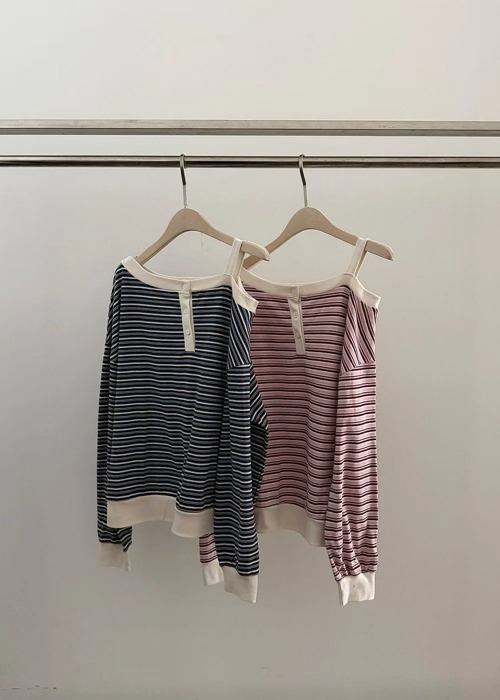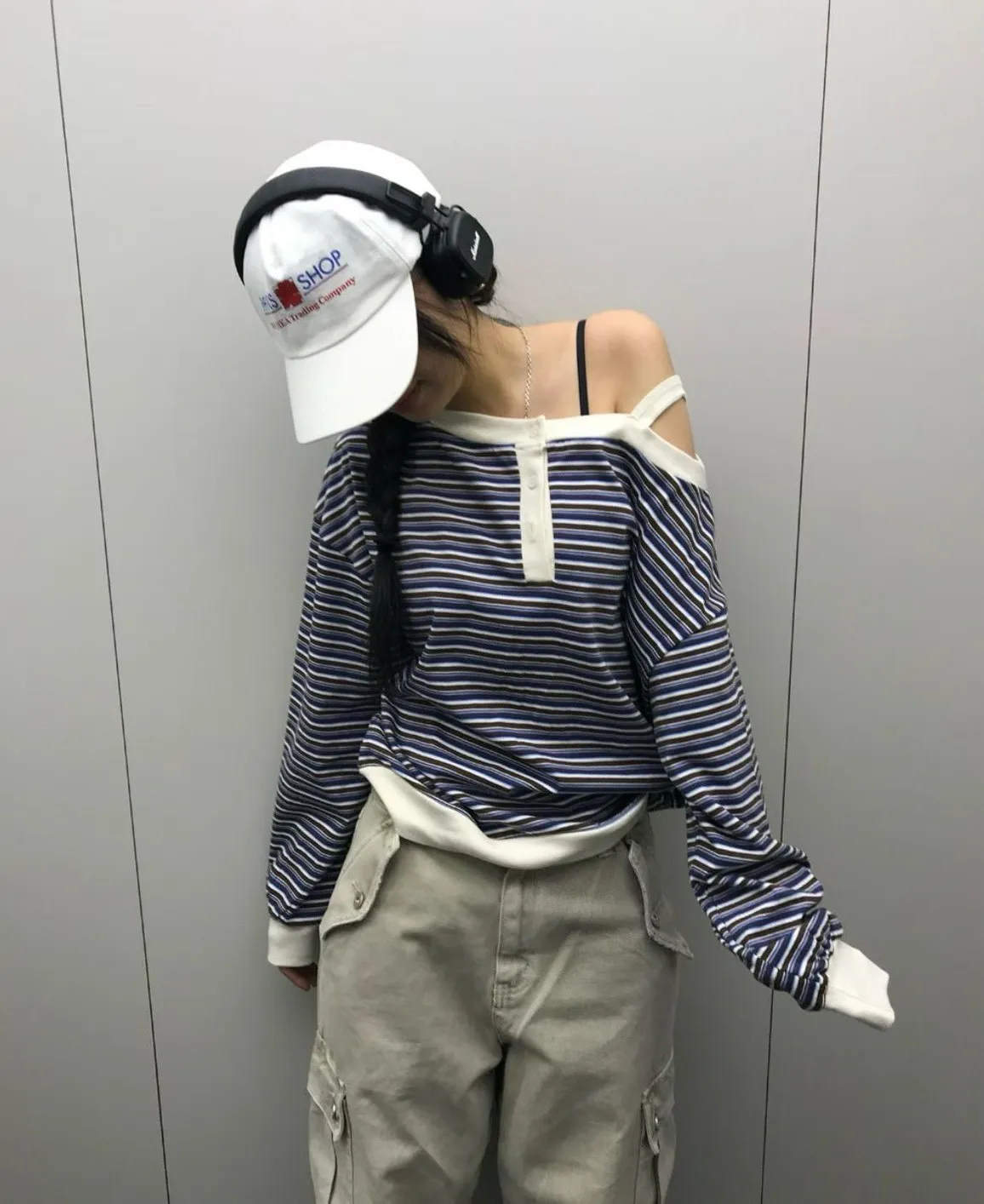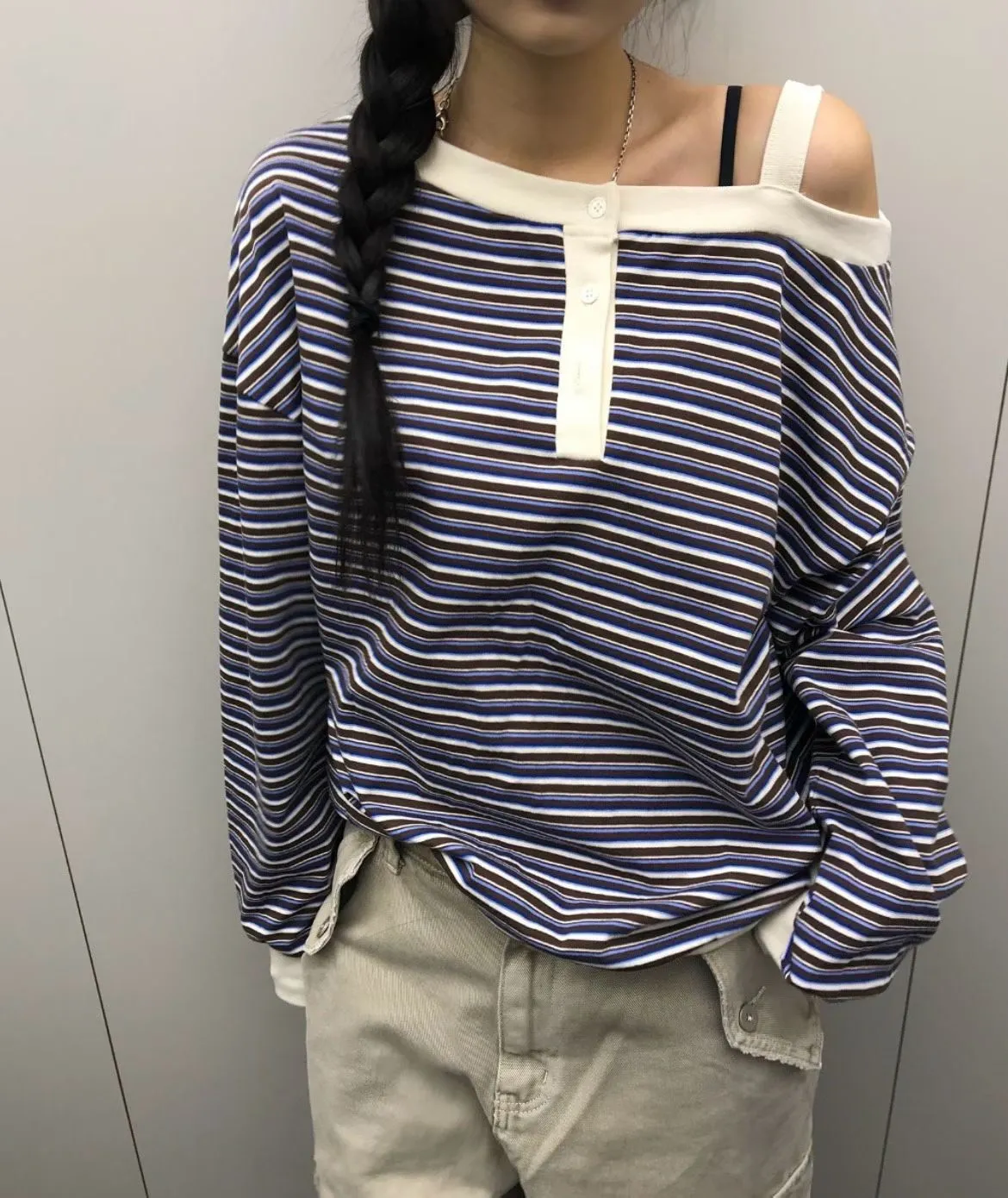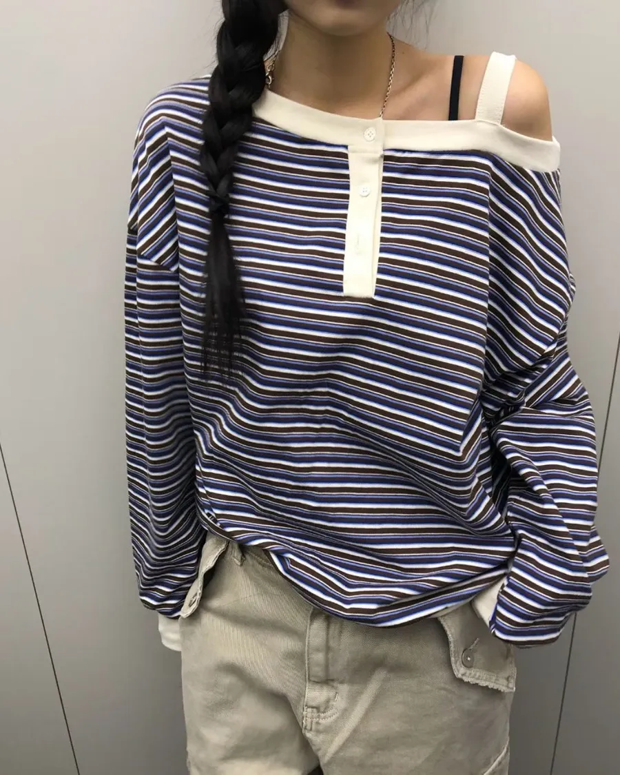 韓版條紋斜肩長袖T恤
