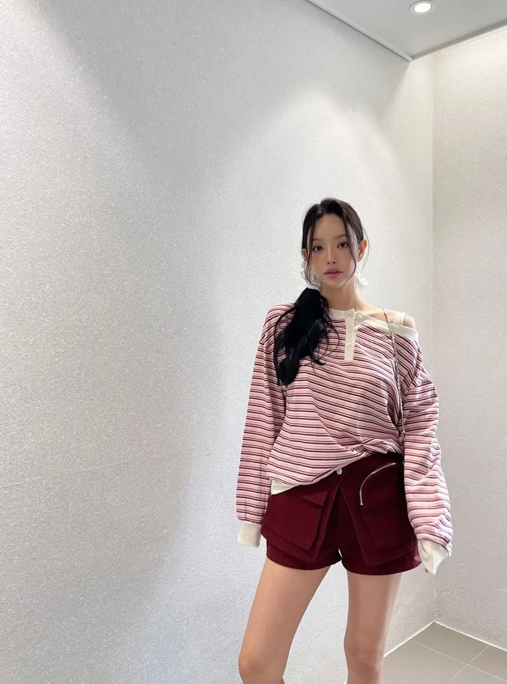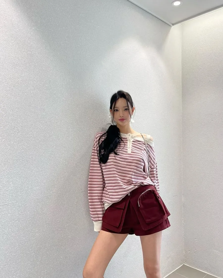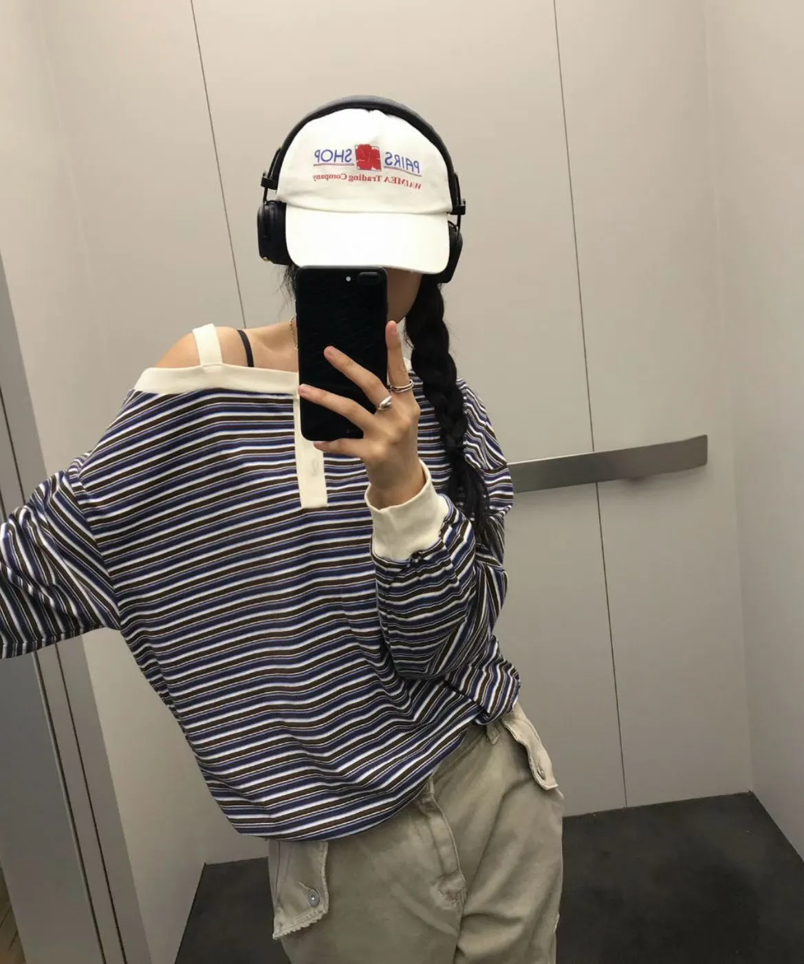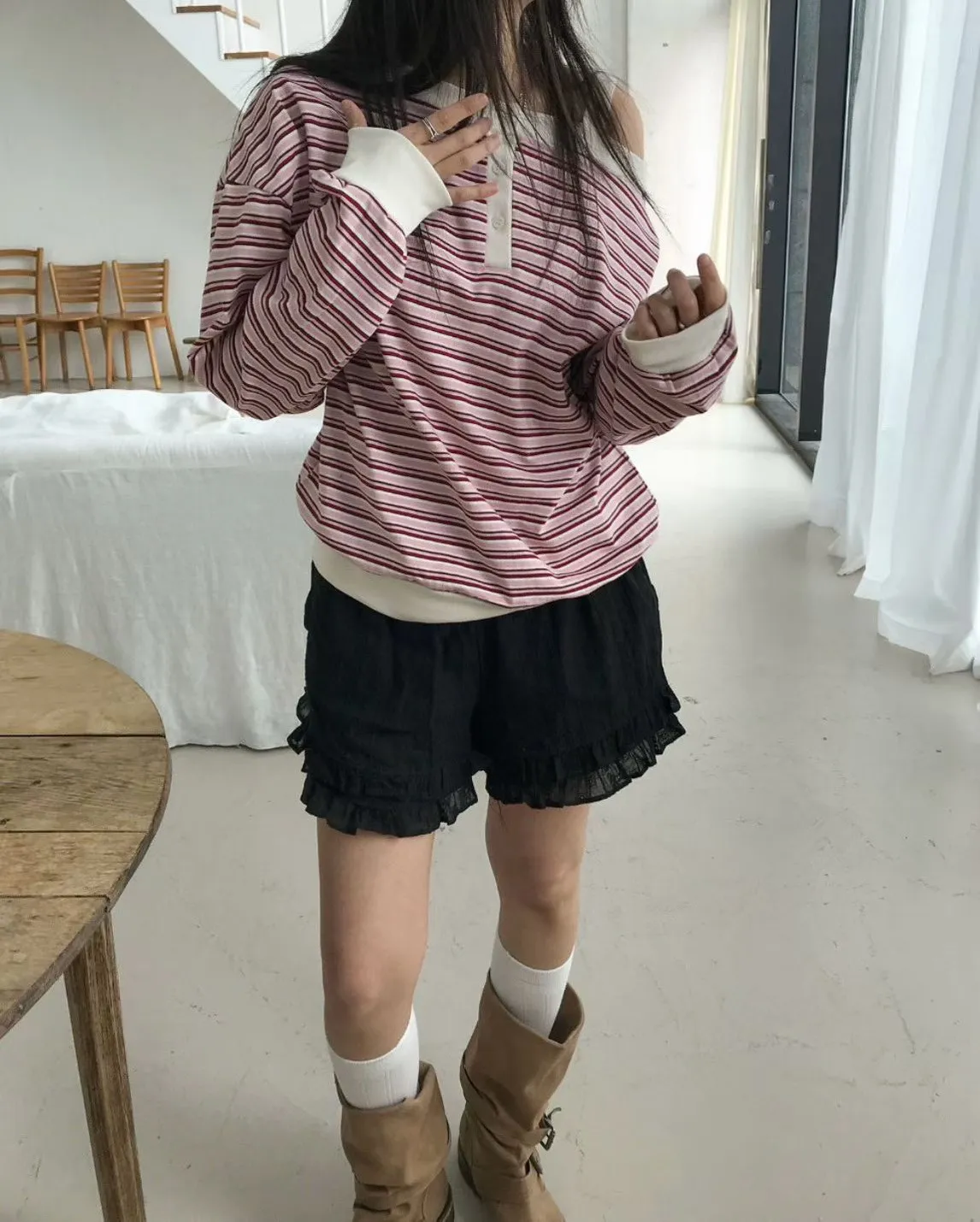 韓版條紋斜肩長袖T恤
